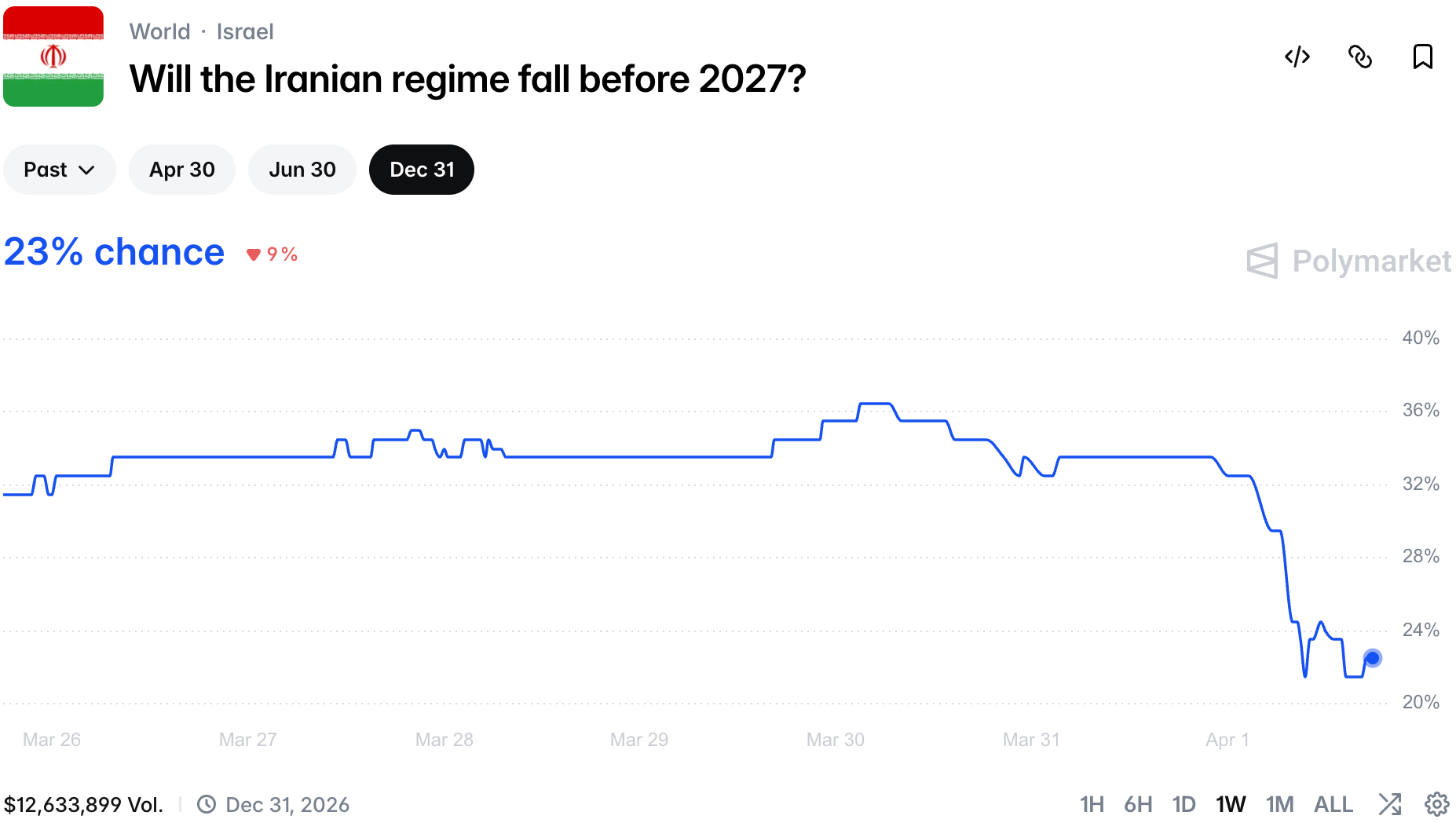 Lastly, Iran regime fall market moved close to our fair value assessment as recent messages from the US indicate they might resign from their goal of regime change.
