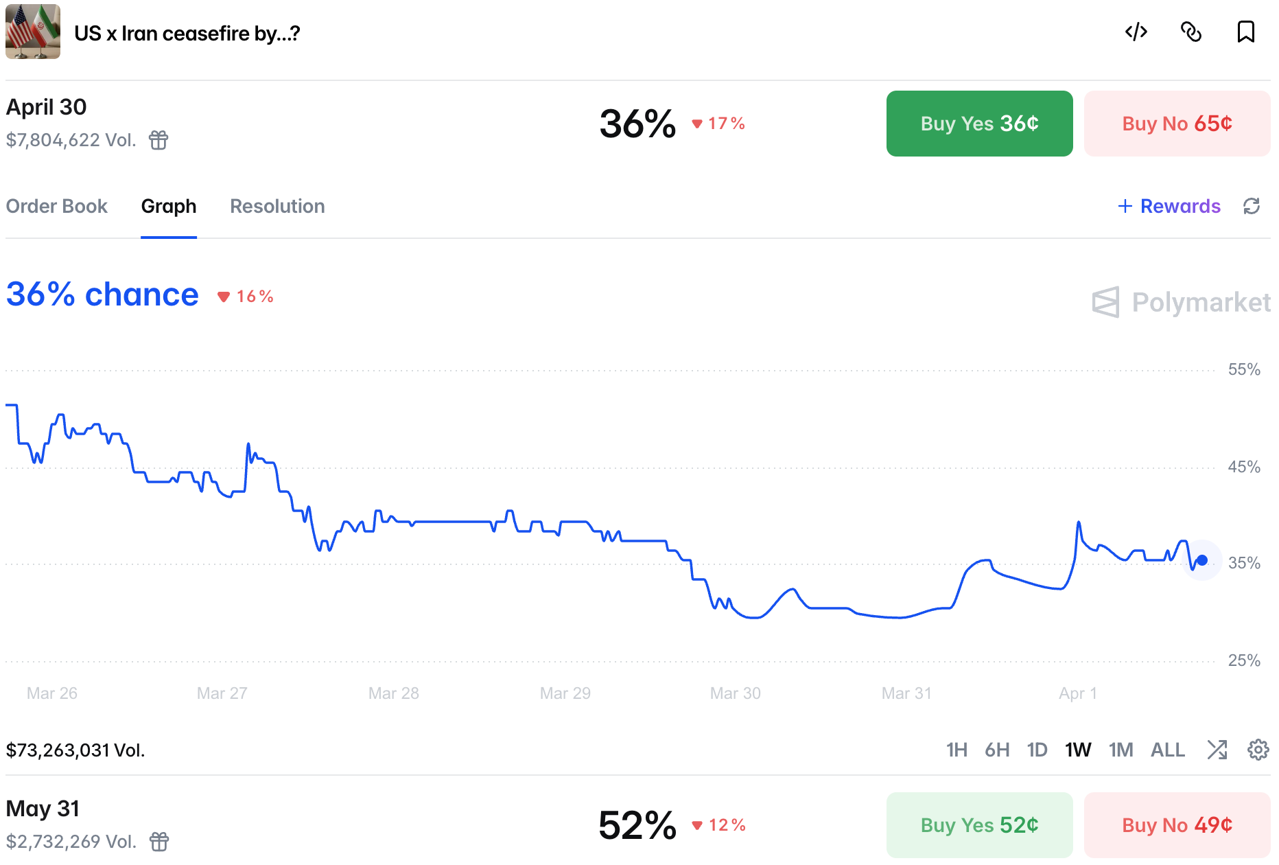 Ceasefire chances remain stable at 36% and 52% for end of April and end of May respectively.