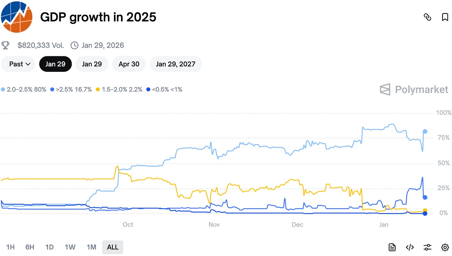 The highest bracket on the market started to rise after Atlanta Fed GDPNow estimate forecasted 5.3% GDP growth for Q4 2025. But the market is about the whole 2025, and estimation is more nuanced than taking an average of Q1-Q4 rates. We guess some traders are in for a surprise.