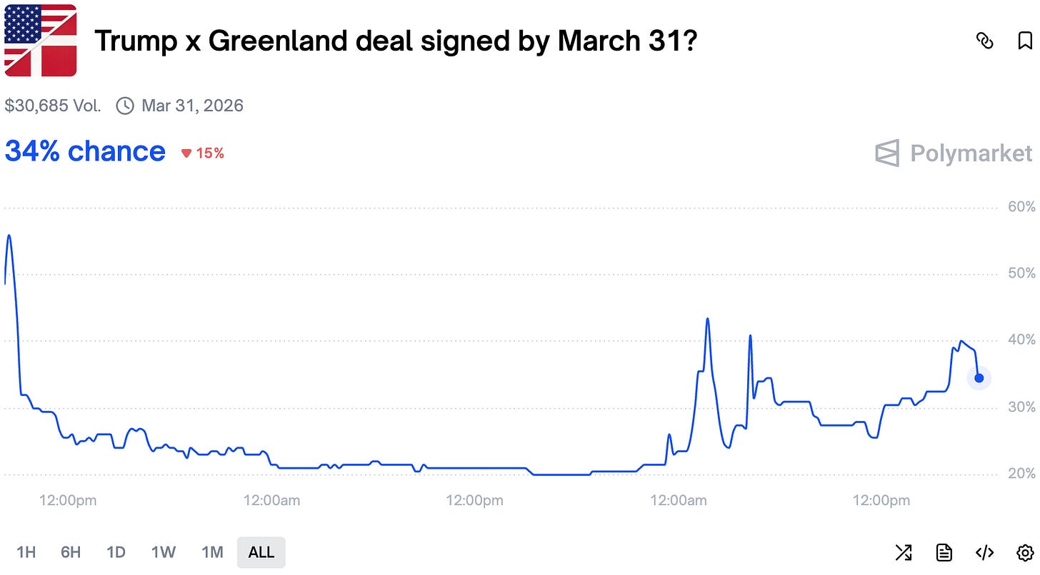 As the pressure mounts on Denmark and Greenland, traders see a path forward, giving 34% chances of a del by the end of the quarter.