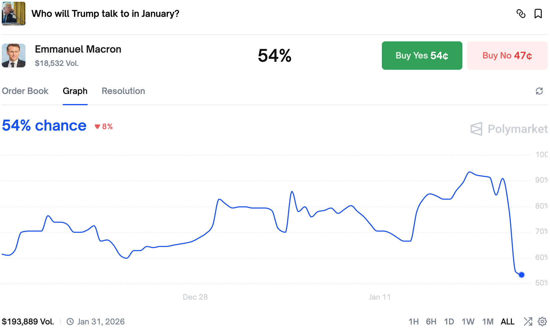 Trump leaked a message from Macron, asking to speak with him in Davos. Then Macron said he has no intention of doing so after all. All the while the tensions between the US and Europe rise and traders get a taste of massive volatility - they still believe there is 54% chance the two will talk this month.
