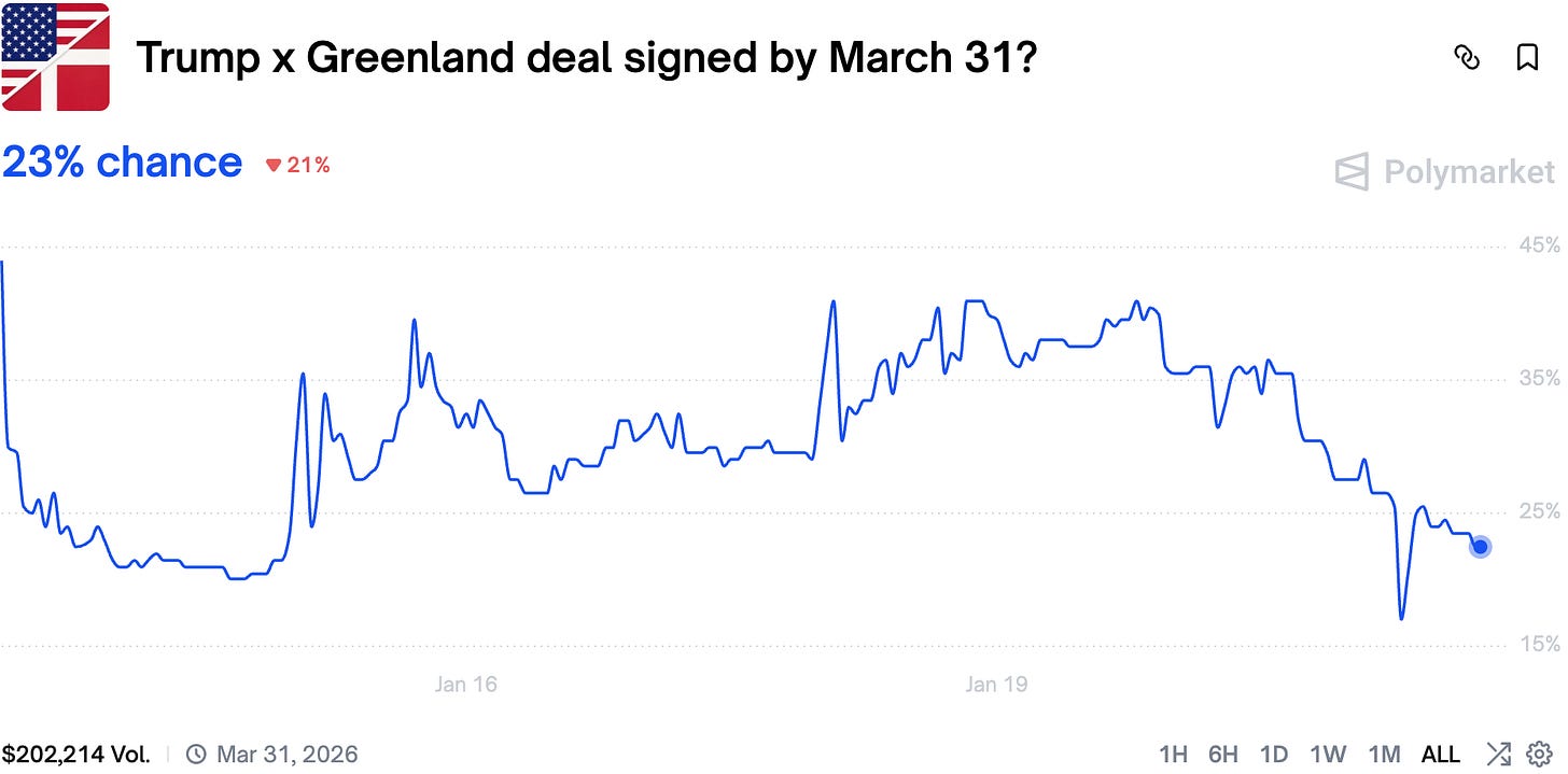 It's probably the hottest topic of the week and yet traders see only 23% chance we will see a deal by the end of March. It's hard to imagine tensions any higher, especially after Bessent called Denmark irrelevant. But maybe Davos can change the course of action. We heard it's a magical place ;)