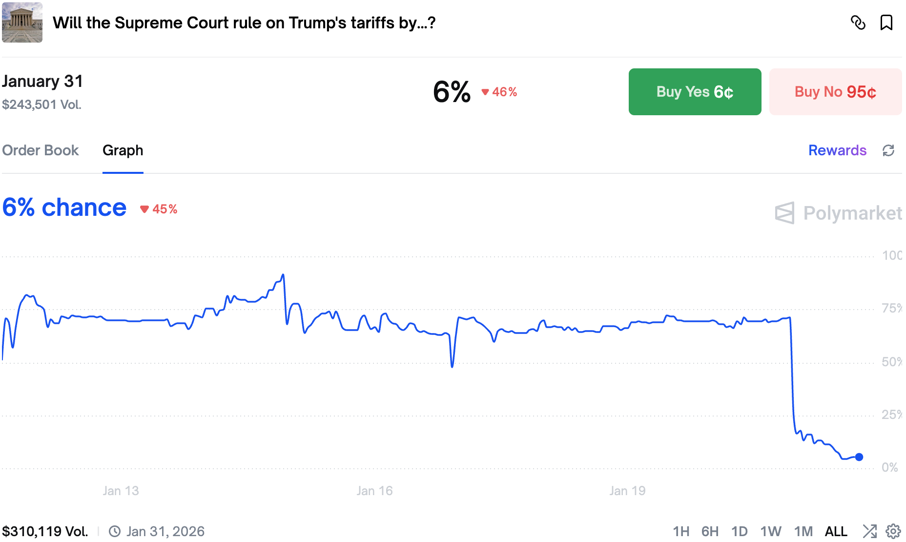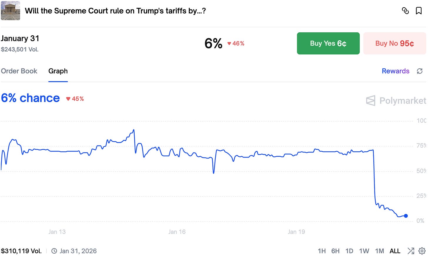 Chances of the SCOTUS ruling on tariffs this month fell sharply after traders realized there are no more slots ahead of the 4-week recess.