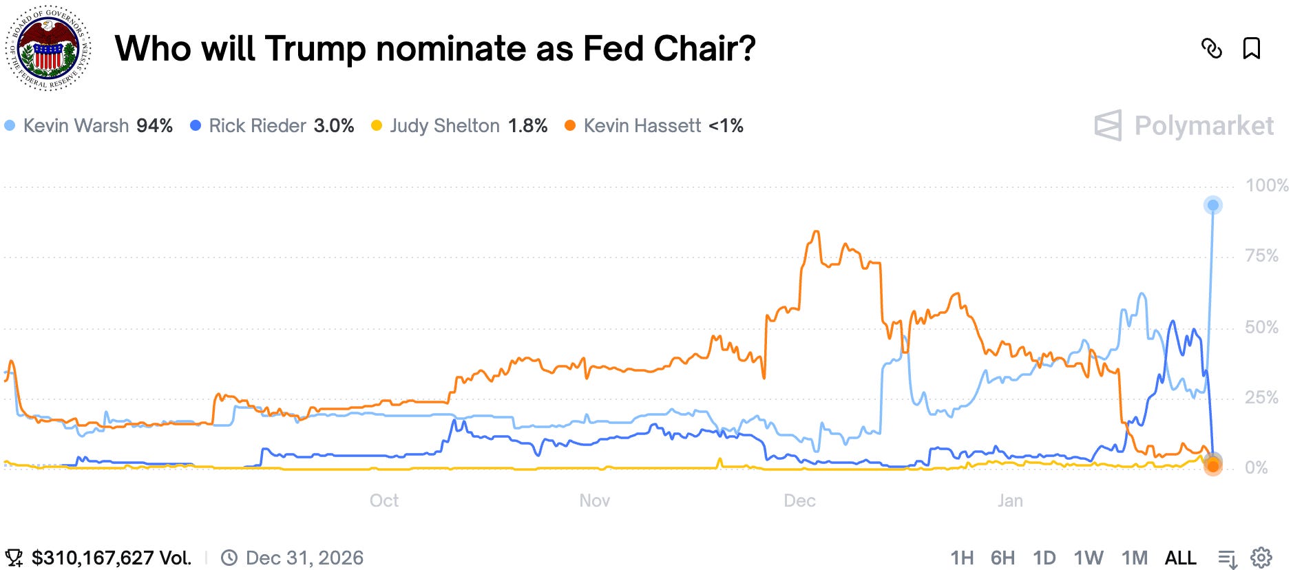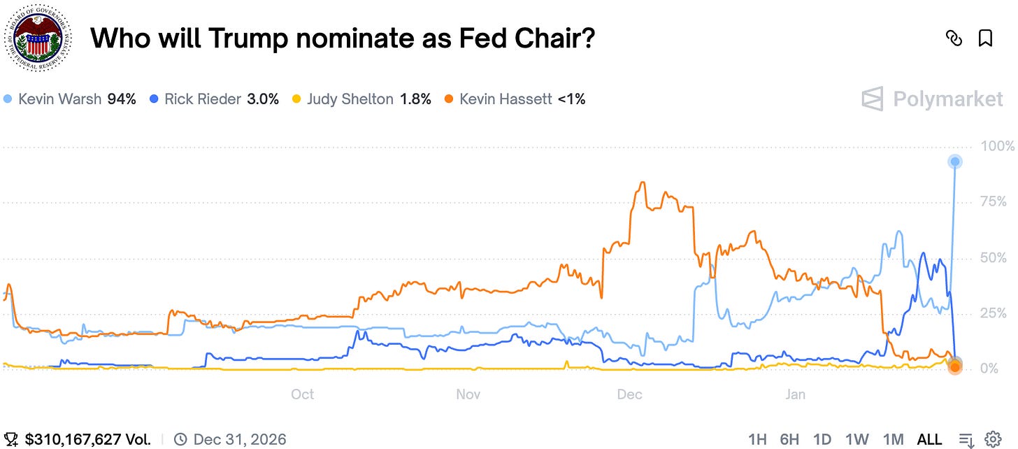 Sharp traders started buying Warsh on the announcement, which was later followed by a flurry of reporting that Warsh is the apparent winner. While keen on cutting rates, Warsh didn't always see eye to eye with Trump when it comes to Fed actions. It is surely shaping up to be an interesting year at the Fed.