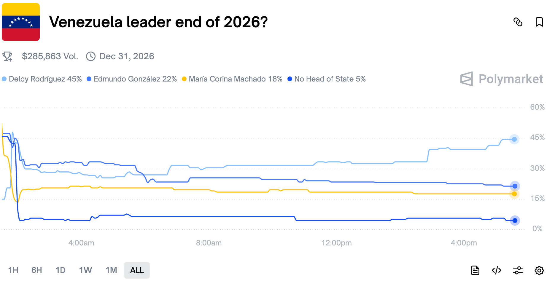 Trump on his press conference said that the US will run Venezuela for the foreseeable future. However, at least officially, there needs to be a head of the Venezuelan state. For now, traders are betting on Maduro's VP, Delcy Rodriguez, but plenty can happen by the end of the year.