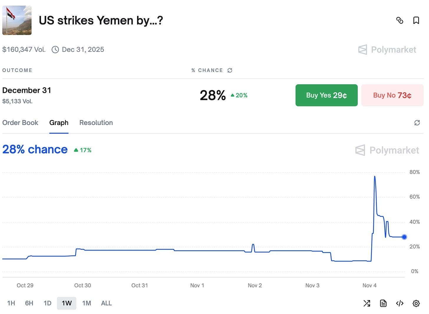 The chances of a US strike on Yemen by the end of the year briefly spiked to almost 80%, fueled by rumors of the strike itself as well as a planned US and Israel military activity in the region.