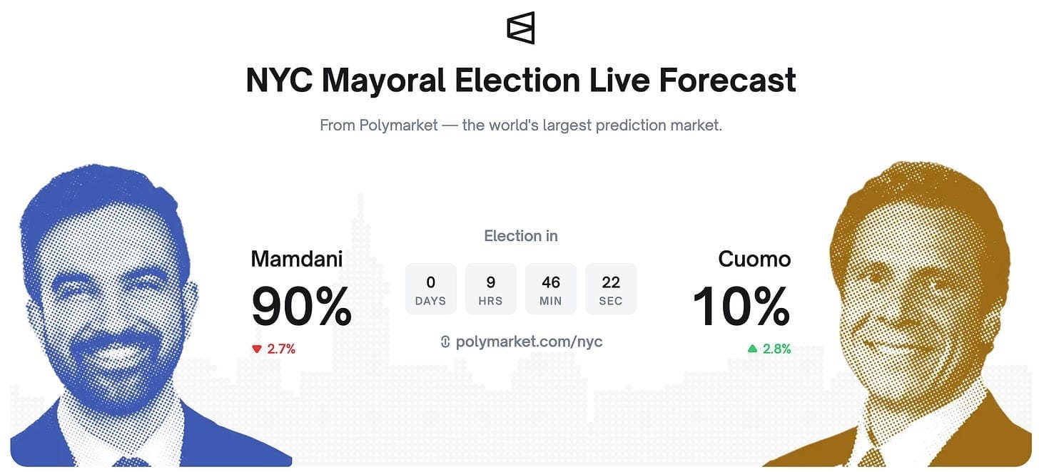 The last hail mary of the center-right has little chances of turning the election though. We are entering the election day with Mamdani being the 90% favorite to win: