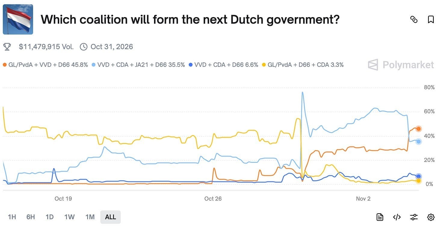 Center parties are trying their best to avoid making a coalition with the right-wing PVV while traders are trying their best to steer between the process and market rules. Latest projections are suggesting a wide coalition and the market will resolve based on top parties being included in the title rather than any one of them being excluded.