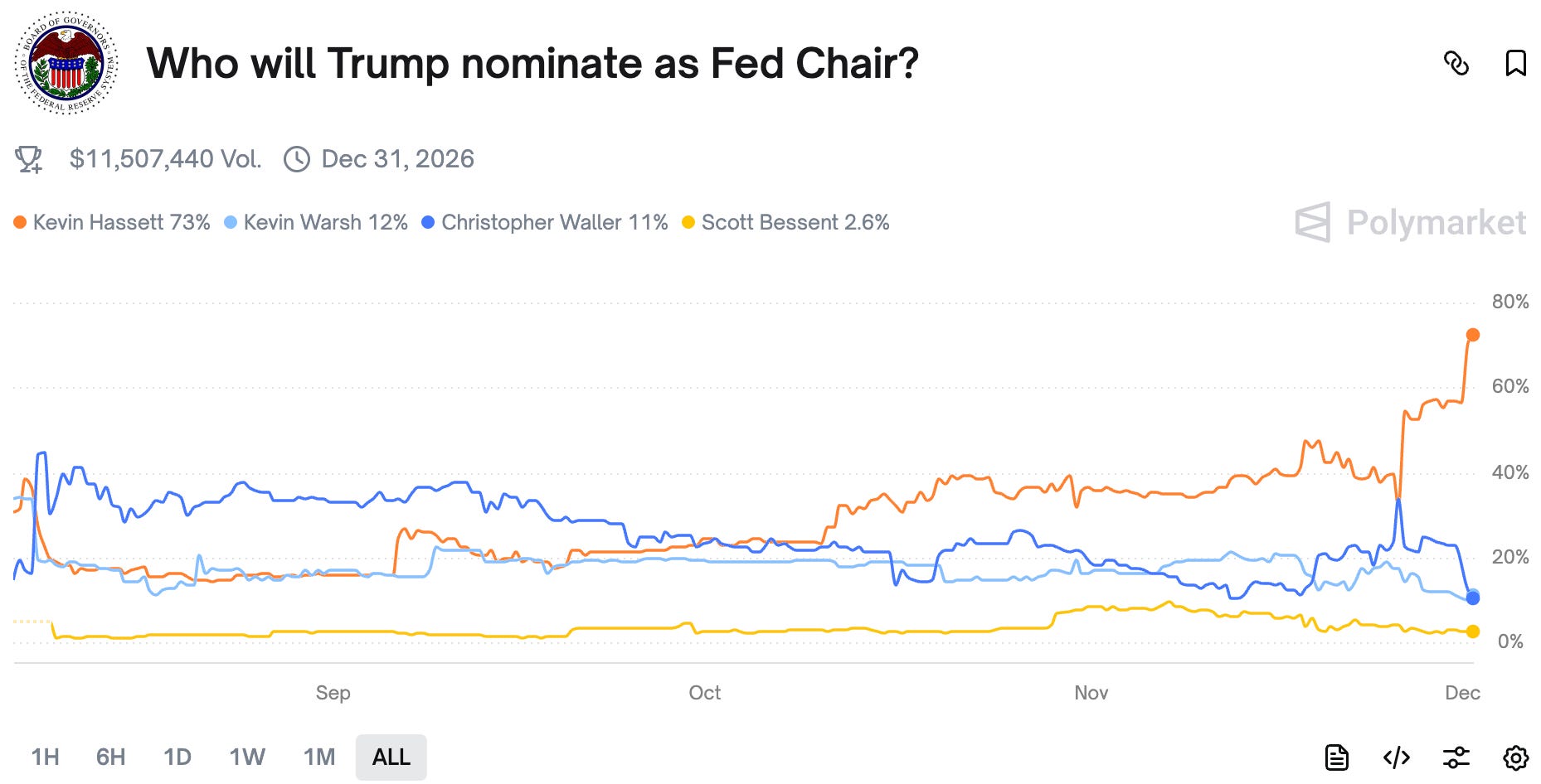 This happened after Bloomberg reported that Trump has made up his mind regarding Jerome Powell's successor. Kevin Hassett was rumored to have had the best interview with Bessent several days ago, thus his odds skyrocketed on the news.