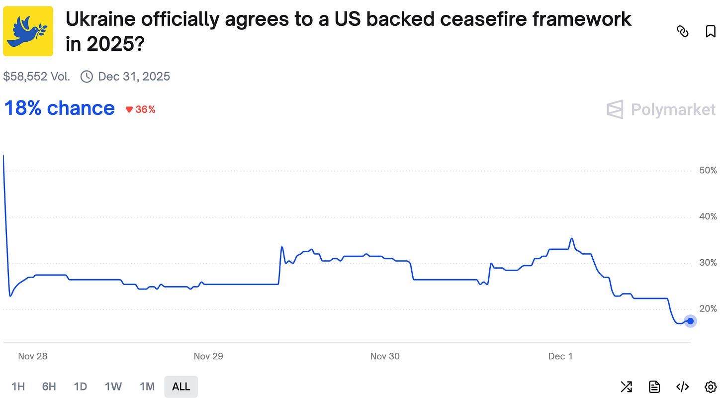 After initial excitement, the odds of Ukraine signing a US backed ceasefire framework in 2025 dived.