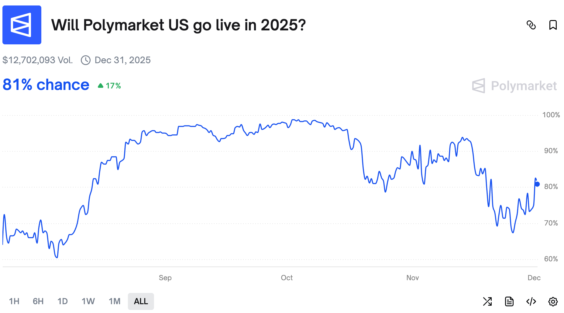 Odds of Polymarket US launching in 2025 are up again.