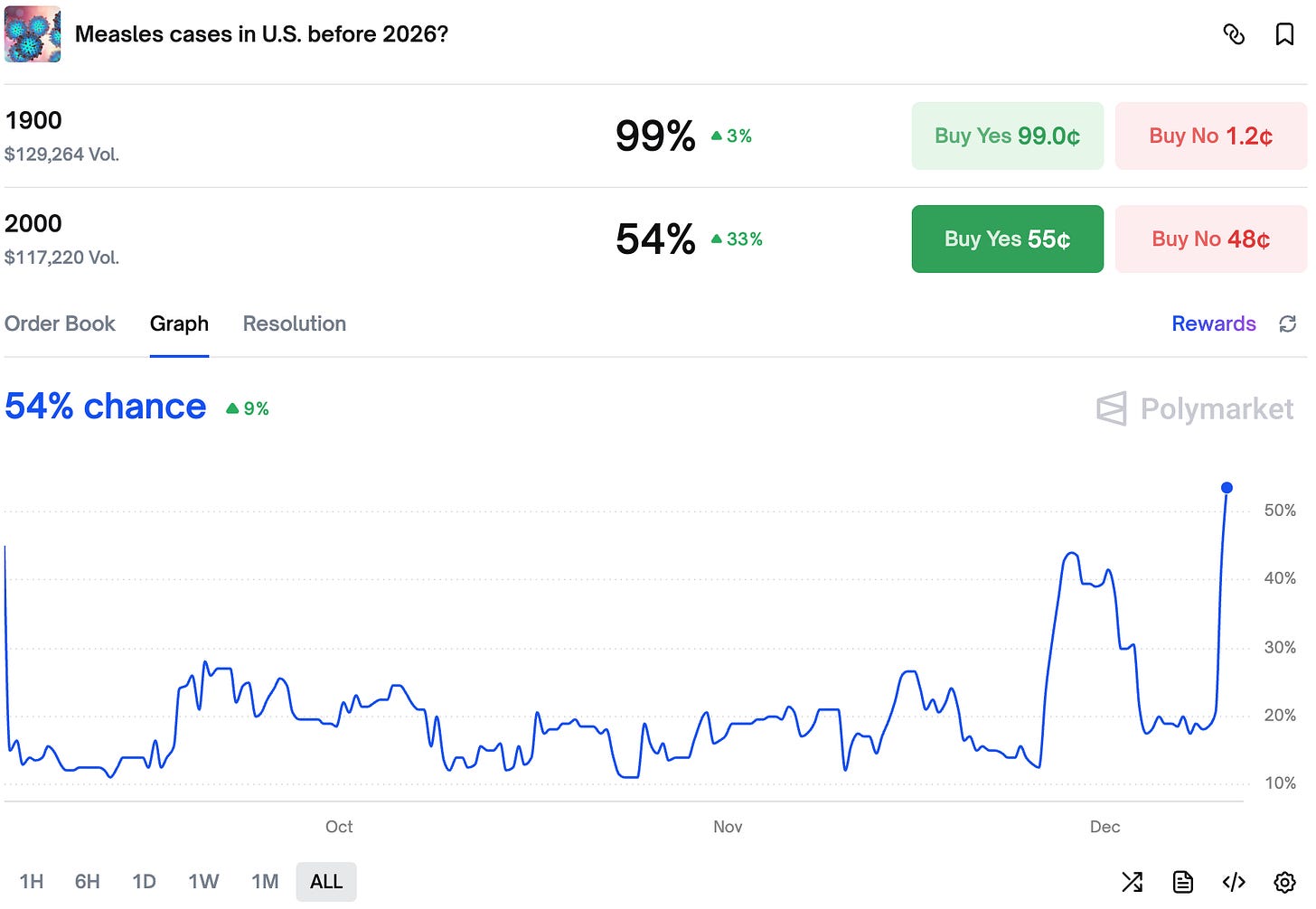 After a brief spike a week ago, traders are once again pricing the chance for over 2,000 measles cases like a coinflip.