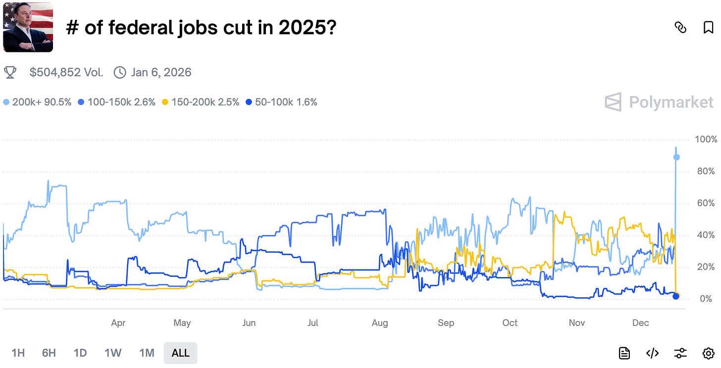Traders sharply adjusted their odds after shutdown layoffs held steady in government data. Looks like DOGE might reach its target after being disbanded.