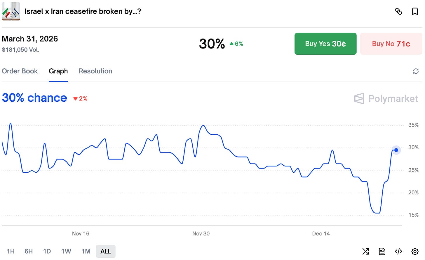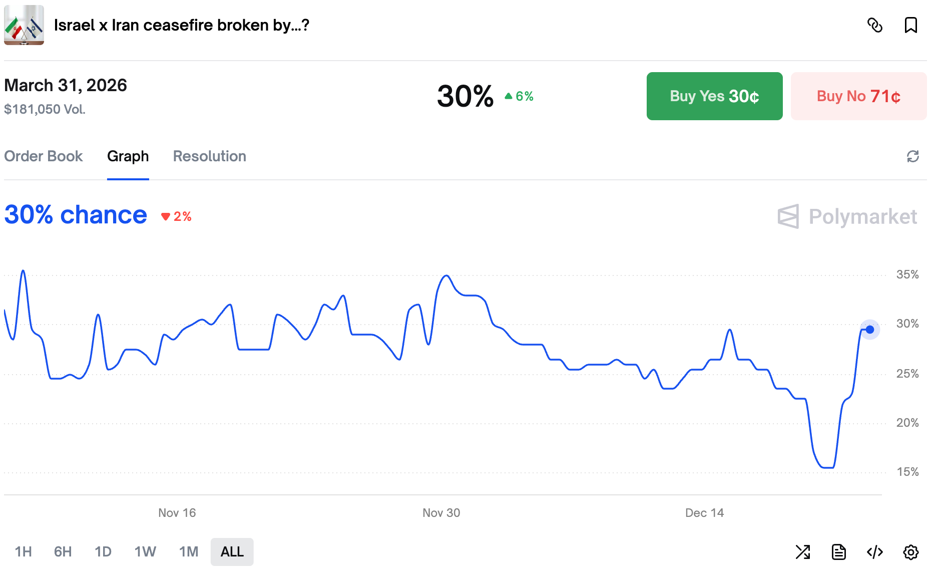 After recent comments from Netanyahu traders sharply adjusted Israel x Iran ceasefire being broken odds.