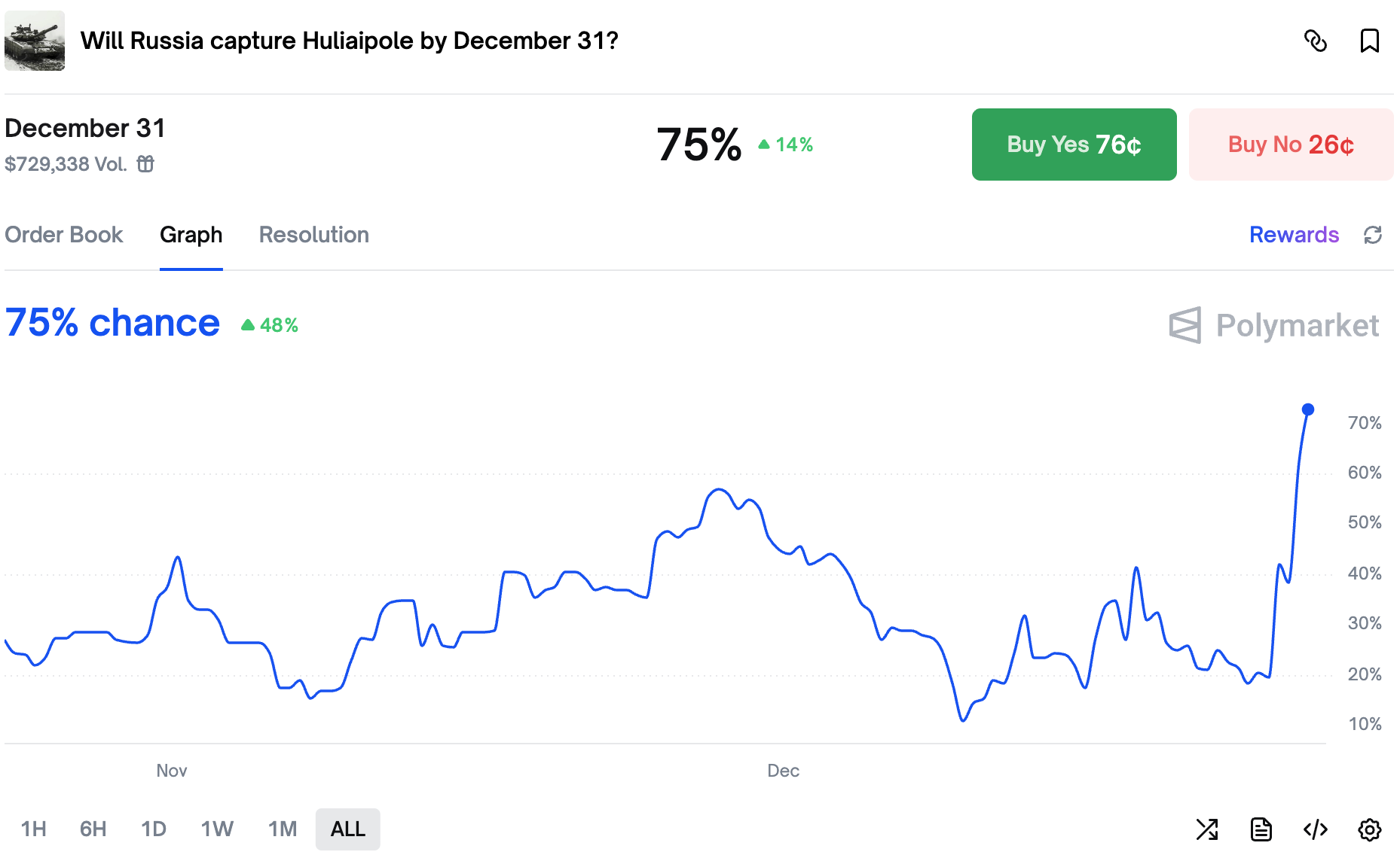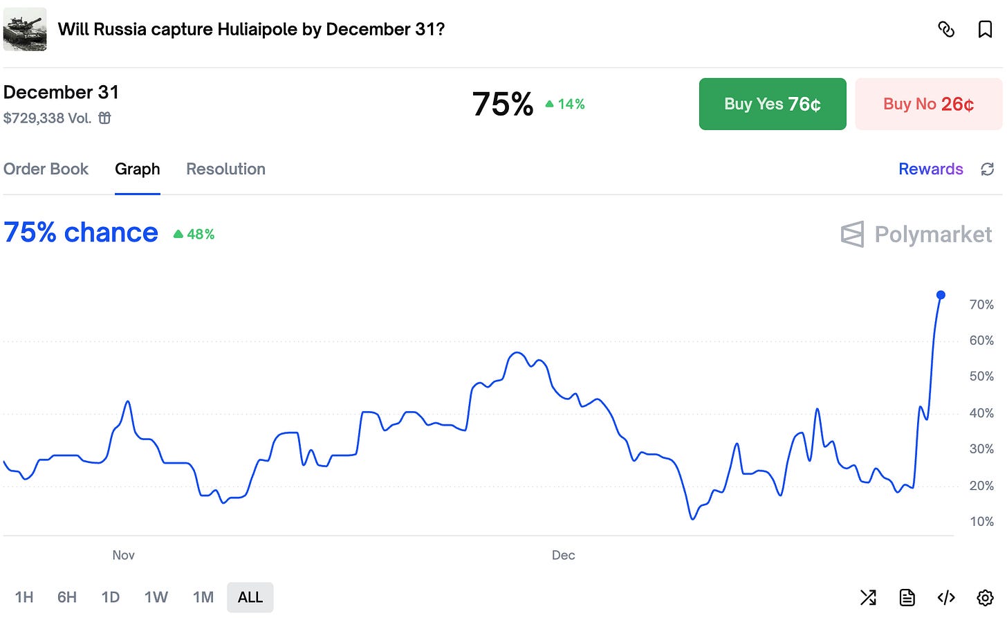 Just a day after we reported on a possible capture of Huliaipole, the odds jumped to 75/25.