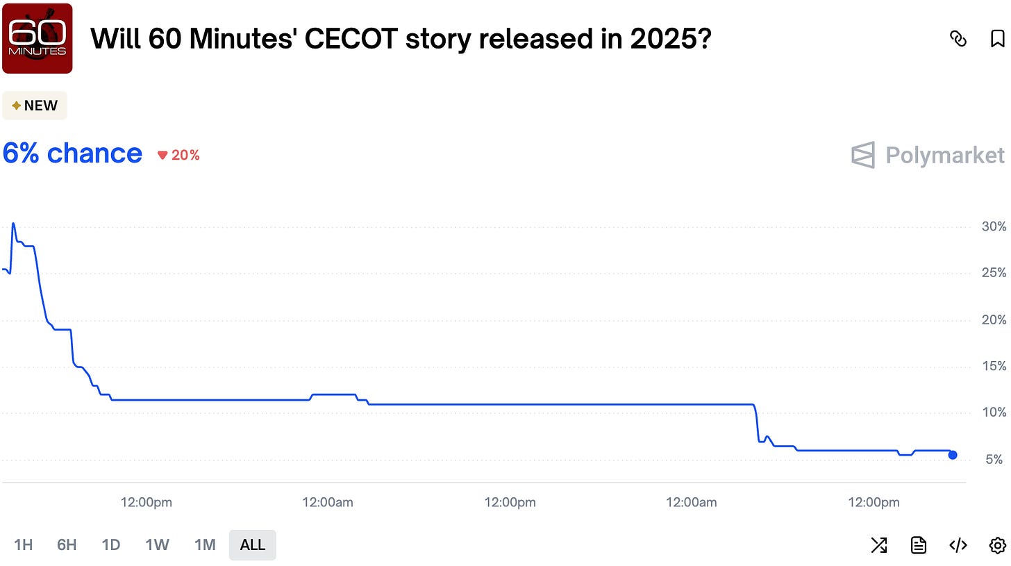 After a bit of drama online, traders think it's unlikely we will see the CECOT story on 60 minutes.