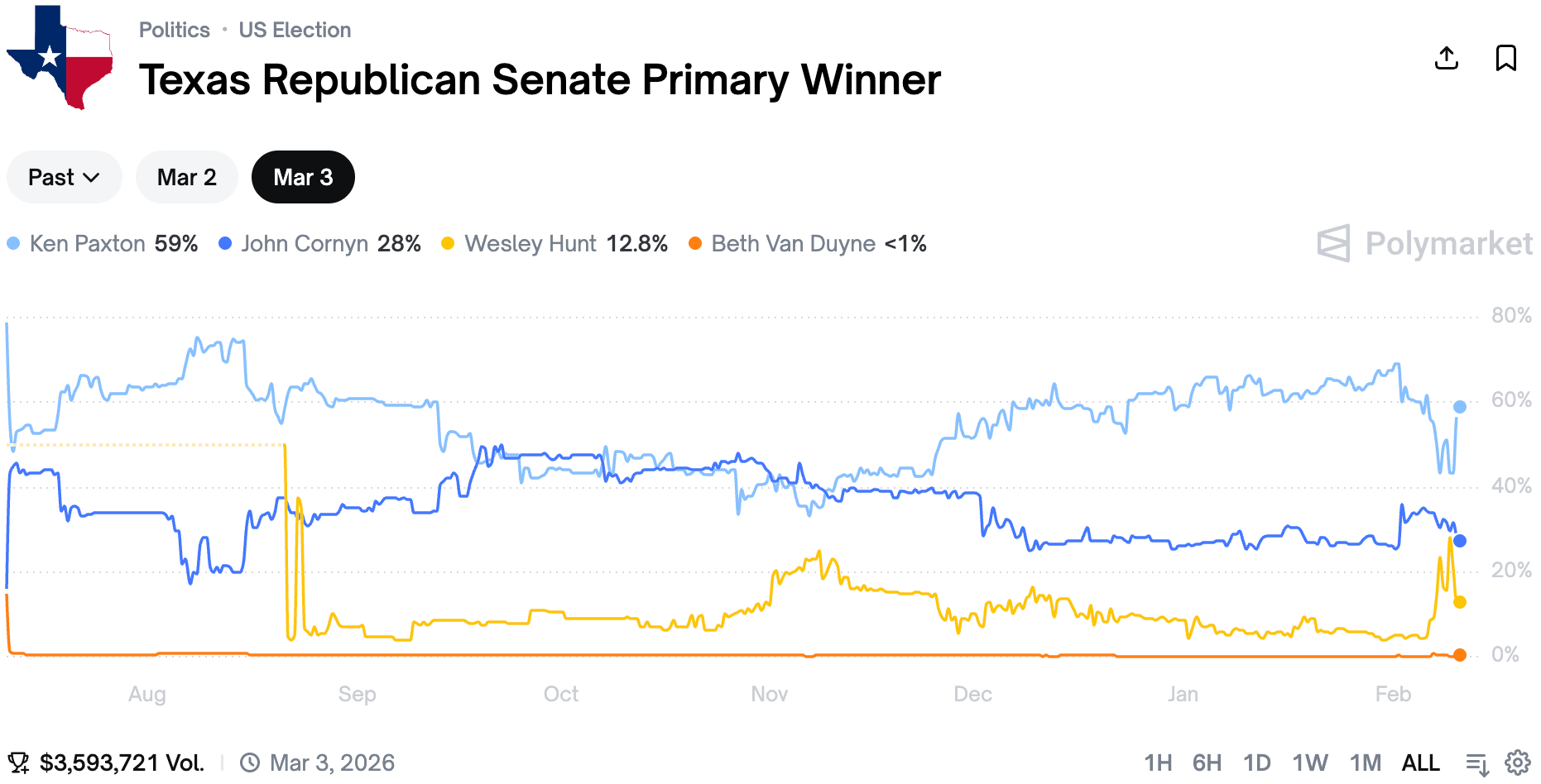 There's been a lot of volatility on the Texas Republican Senate Primary market where Ken Paxton dropped from almost 70% chances to win, down to 45%, only to rebound to 59% hours later.