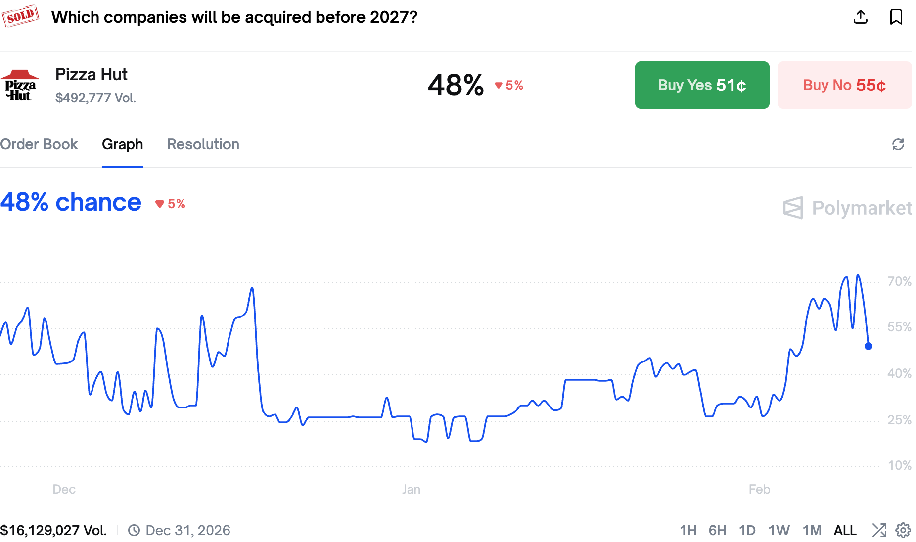 The market became bullish briefly for a Pizza Hut acquisition after it was announced that the chain will close 250 locations in the US soon.