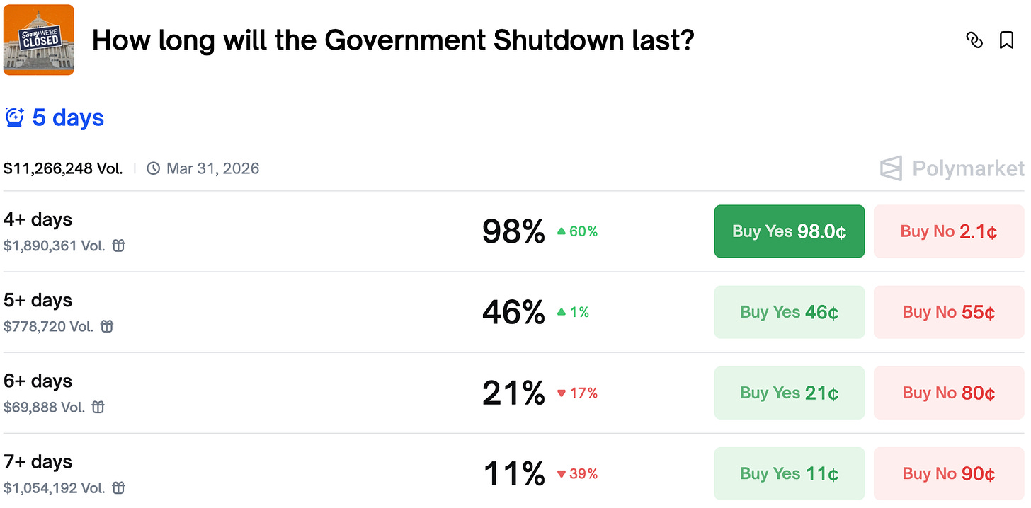 After it turned out there will be a partial shutdown after all, traders moved their forecast and the market now sees a 5-day shutdown while Democrats and Republicans discuss DHS funding. Democrats demand concessions after the tragic events in Minnesota.