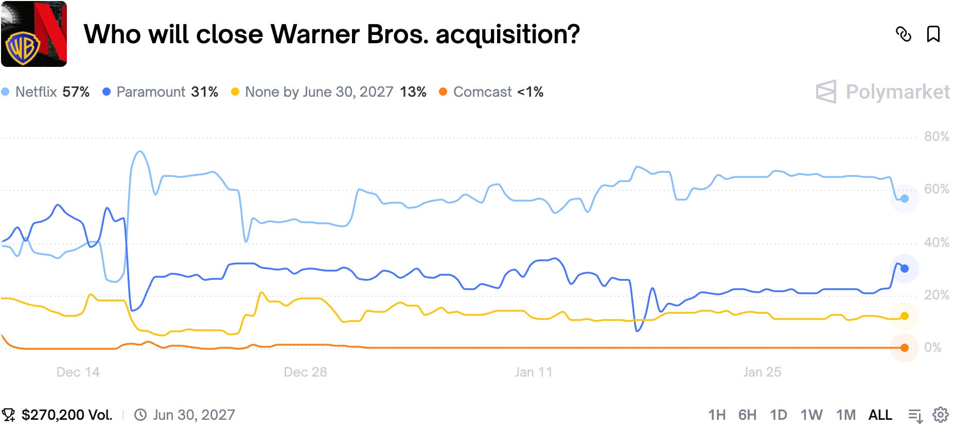 We are not sure what pushed the chances up as there is no news around a new offer. The only bit of signal we could find is this Reddit post which claims that Paramount is bidding for Warner Bros. shares with $2.50 premium per share OTC, possibly to do a hostile takeover of the company, or at the minimum complicate Netflix's plans.
