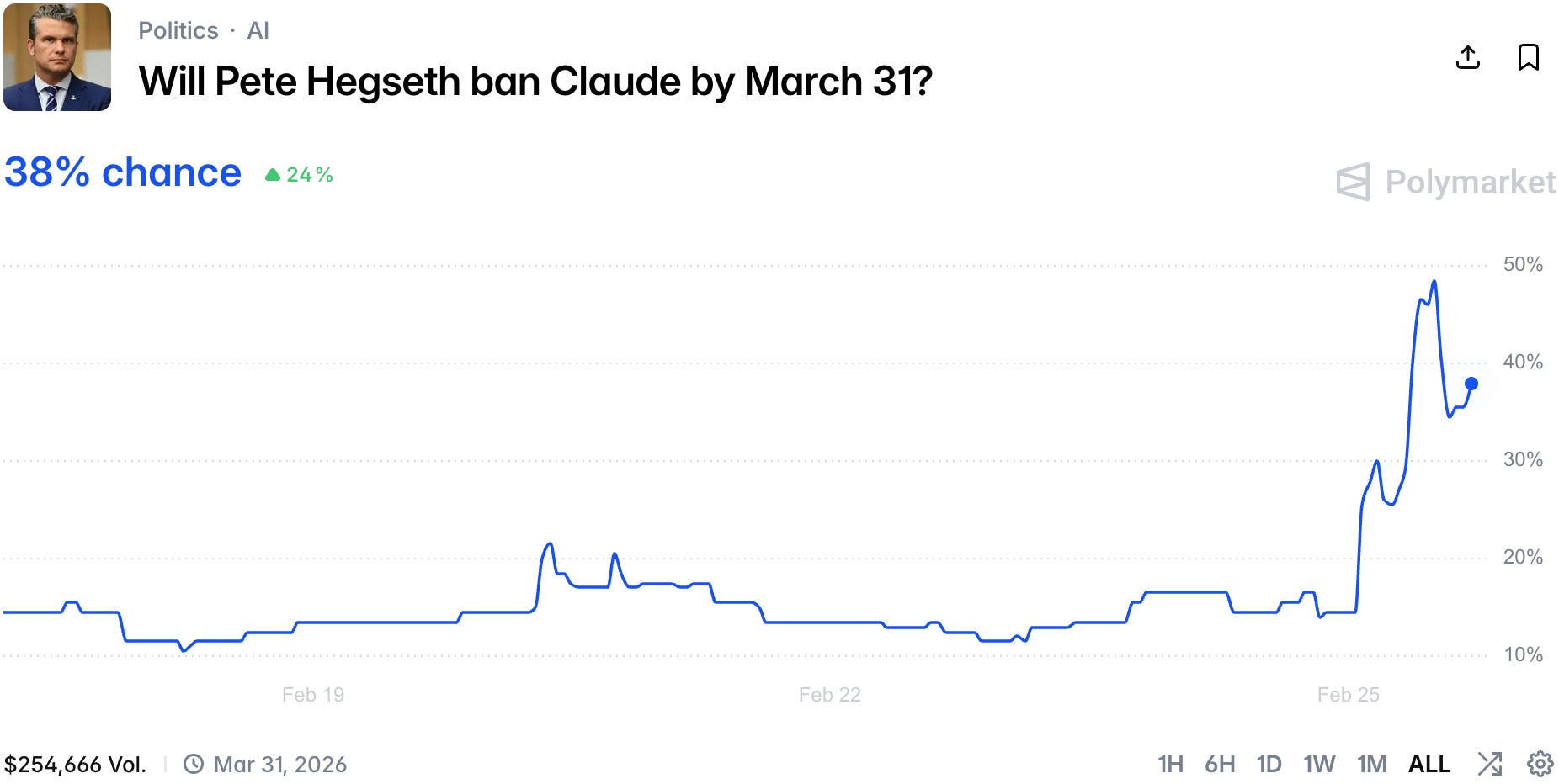 the market is now leaning towards Anthropic being banned from the Department of War, after media reports showed that Hegseth is pressuring Anthropic and threatening cutting ties with the company.