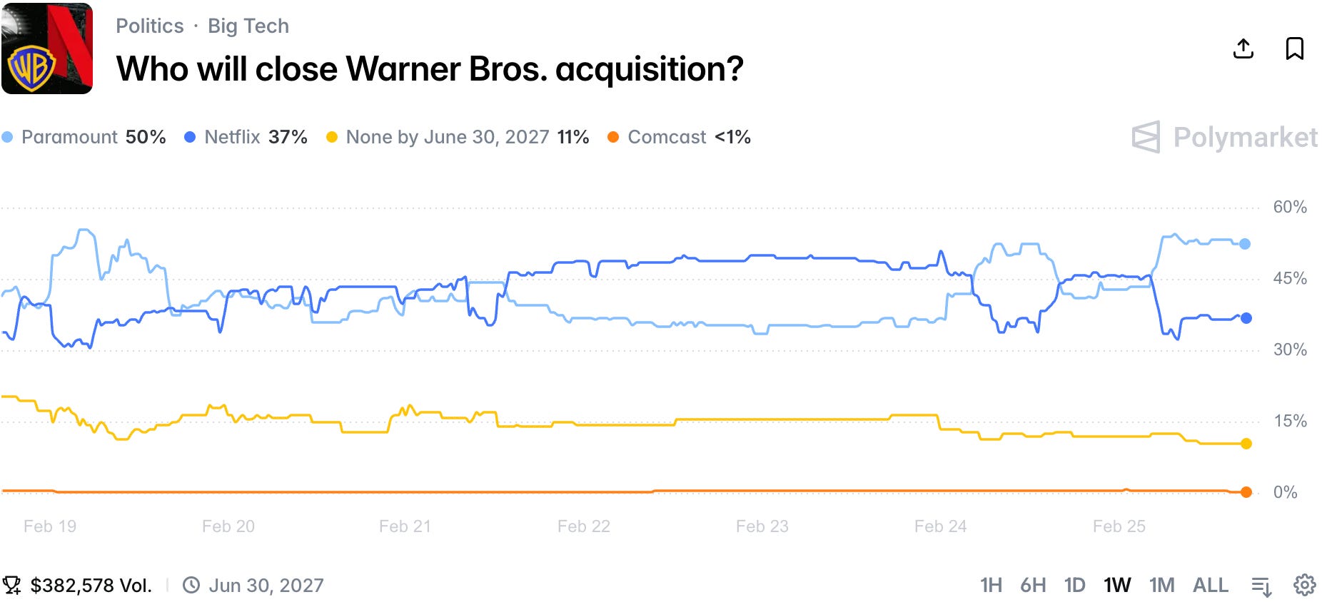 After reports that Warner Bros. is entertaining Paramount's new offer, the market has now the latter as the favorite to acquire Warner Bros.