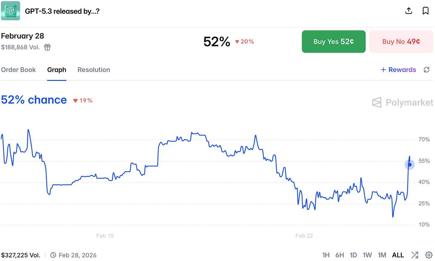 Everyone has been expecting to see ChatGPT 5.3 soon, but the market had only ca. 30% chance it will be this week. However, since one of the top holders of No switched sides to Yes on February market, price moved significantly indicating we now have 52% chance to see the model live by the end of the month.