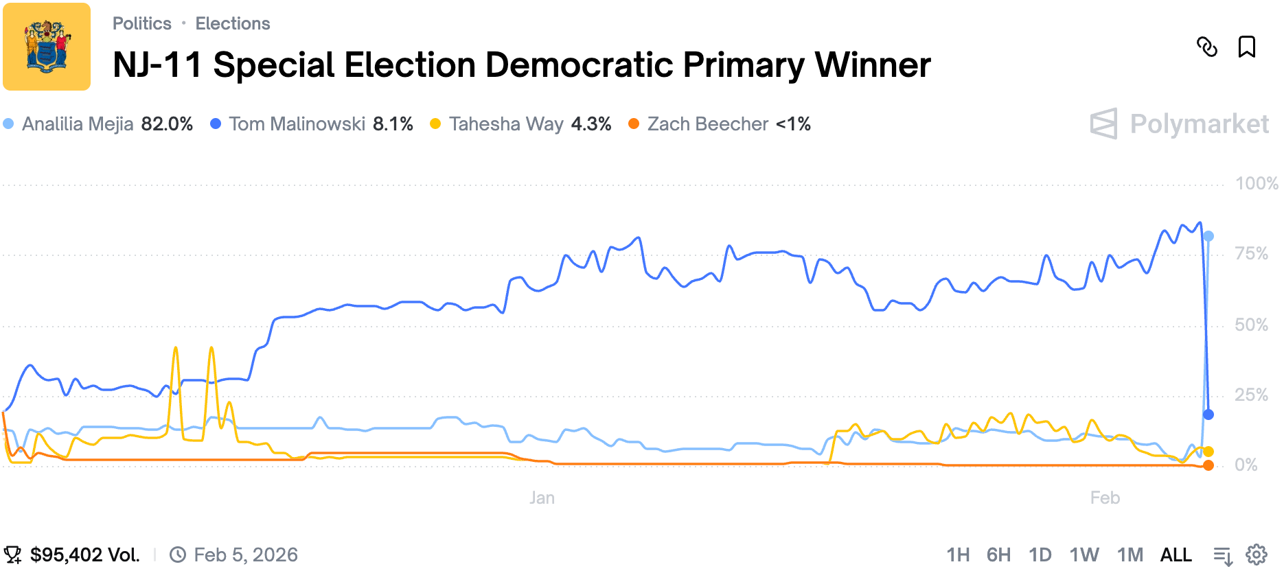 We were able to witness a rare event on prediction markets where Analilia Mejia is poised to win a surprising victory over Tom Malinowski in NJ-11 Special Election Democratic Primary.
