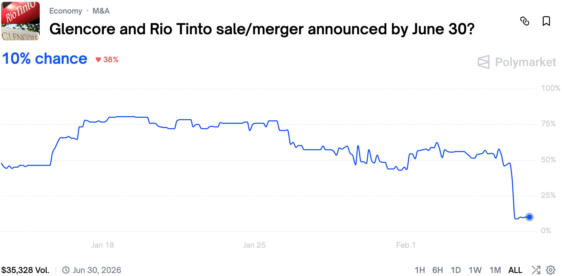The market adjusted Yes price sharply as it turned out that the parties couldn't really agree on respective valuations. It's a common thing during megamerger talks, but considering how volatile current mining industry is, it isn't necessarily the last time we are hearing about this merger.