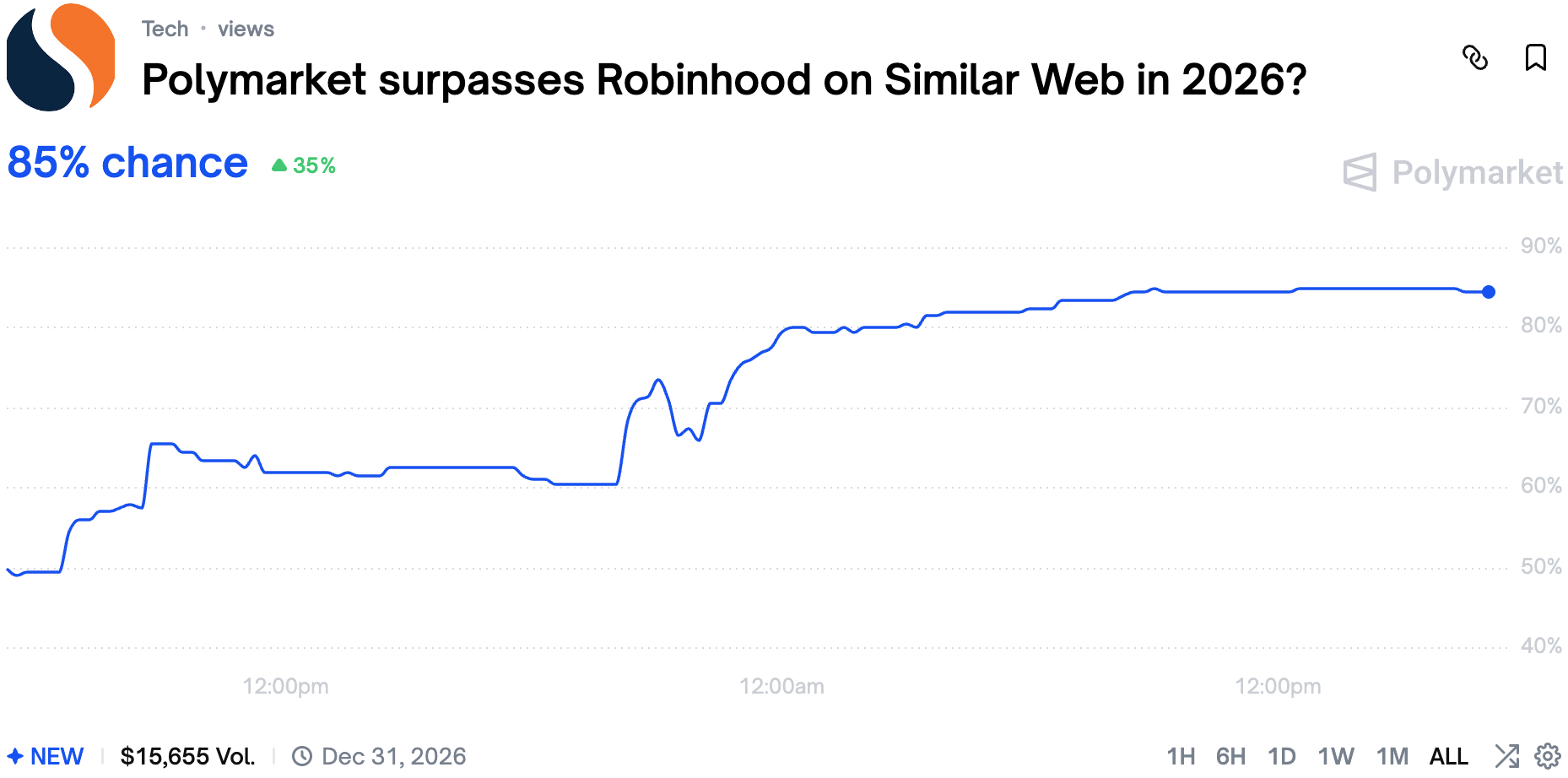 Every day prediction markets gain in popularity. So much so that now the market believes Polymarket will be more popular than Robinhood in the near future.