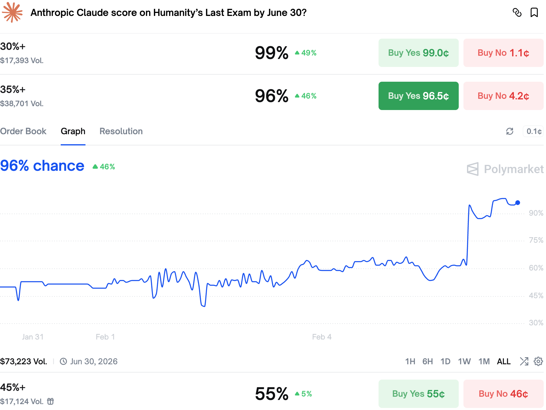 The current high score belongs to Google Gemini 3 Pro, but it seems Anthropic Claude Opus 4.6 can beat that. 35% is almost a given while a record breaking 45% is probable by the end of June. Maybe the AI bears are wrong?
