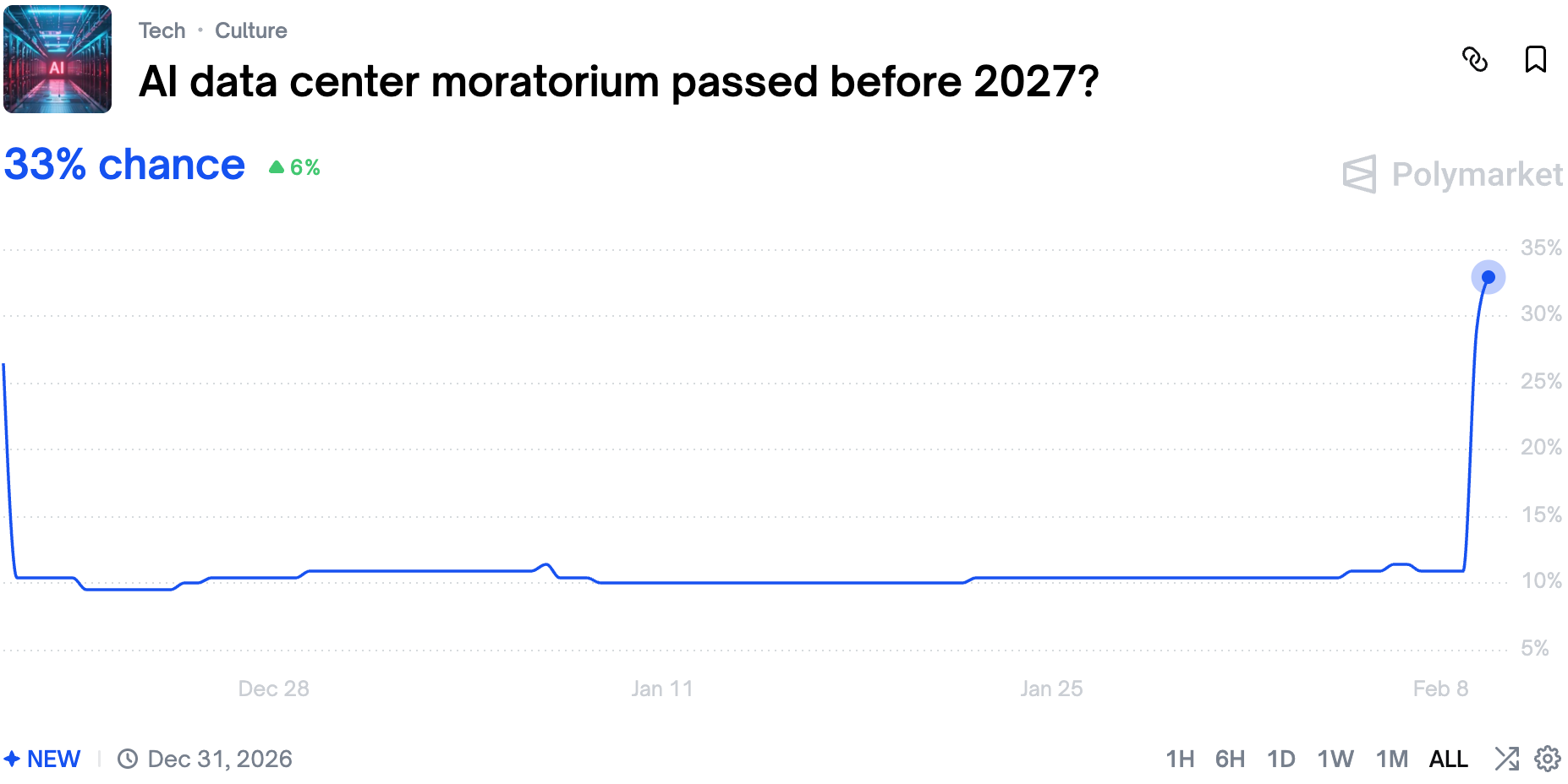 After this market launched, immediately traders doubted that any kind of AI data center moratorium can pass, as these data centers are almost solely responsible for US GDP growth in the recent months.