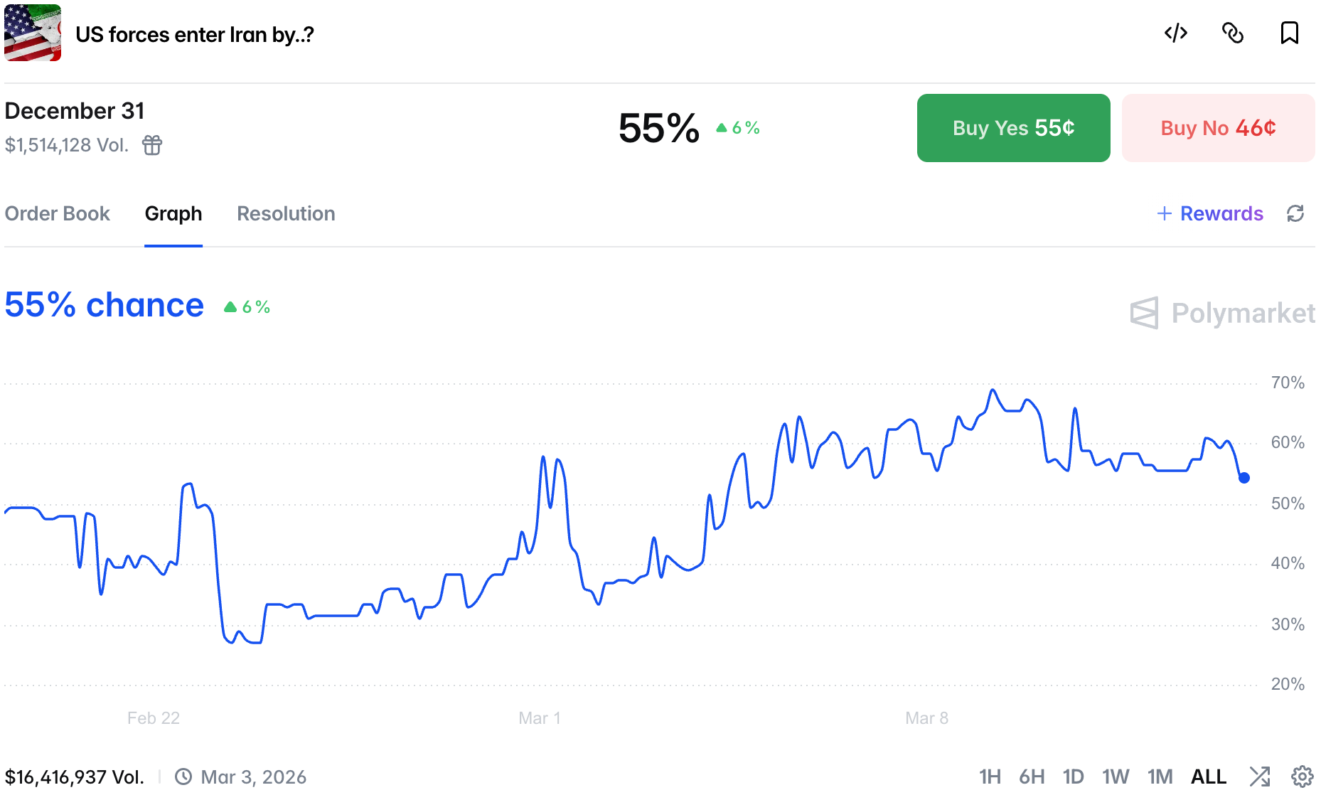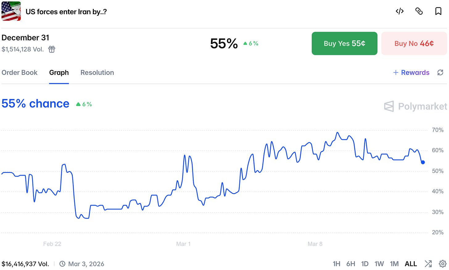 Somewhat shockingly, amid all the new rumors, the prospect of US forces on the ground fell to 55%.