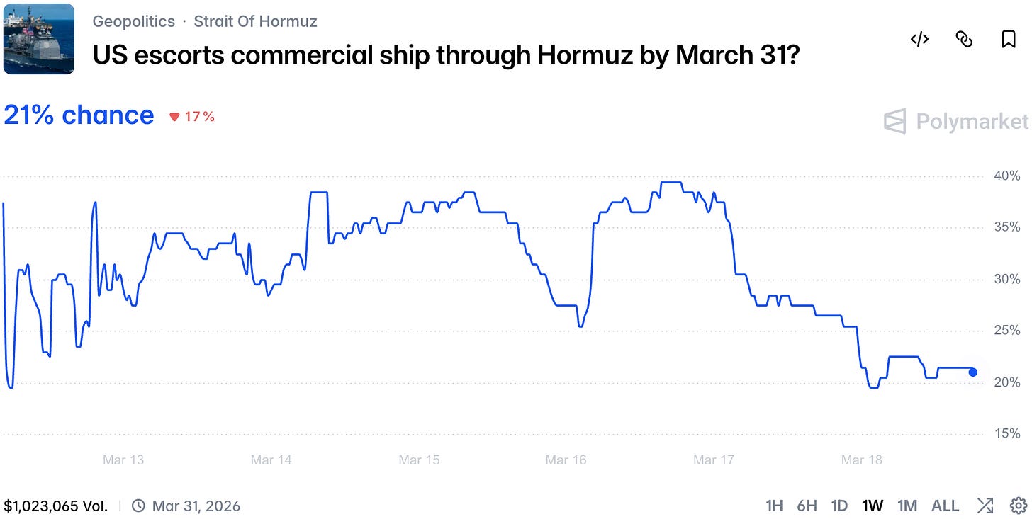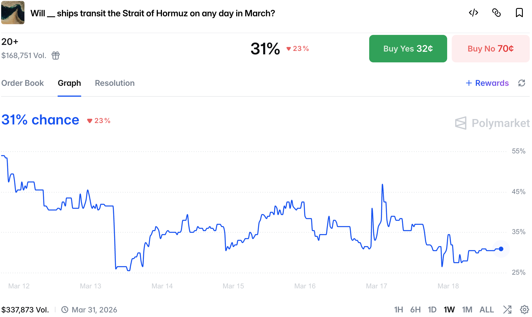 The Strait of Hormuz continues to be effectively closed with now only 31% chance we will see over 20 ships pass it in a single day by the end of the month.
