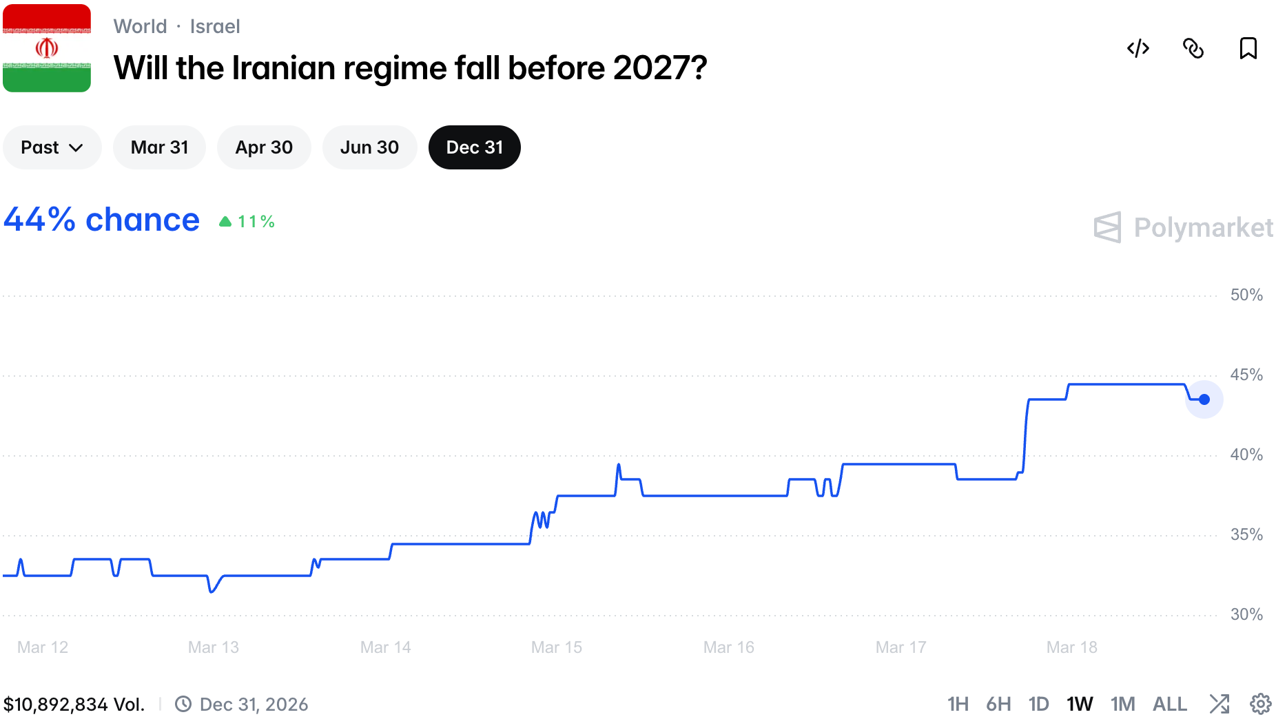 Iran regime fall chances stay elevated after Larijani was assassinated by an Israeli strike.