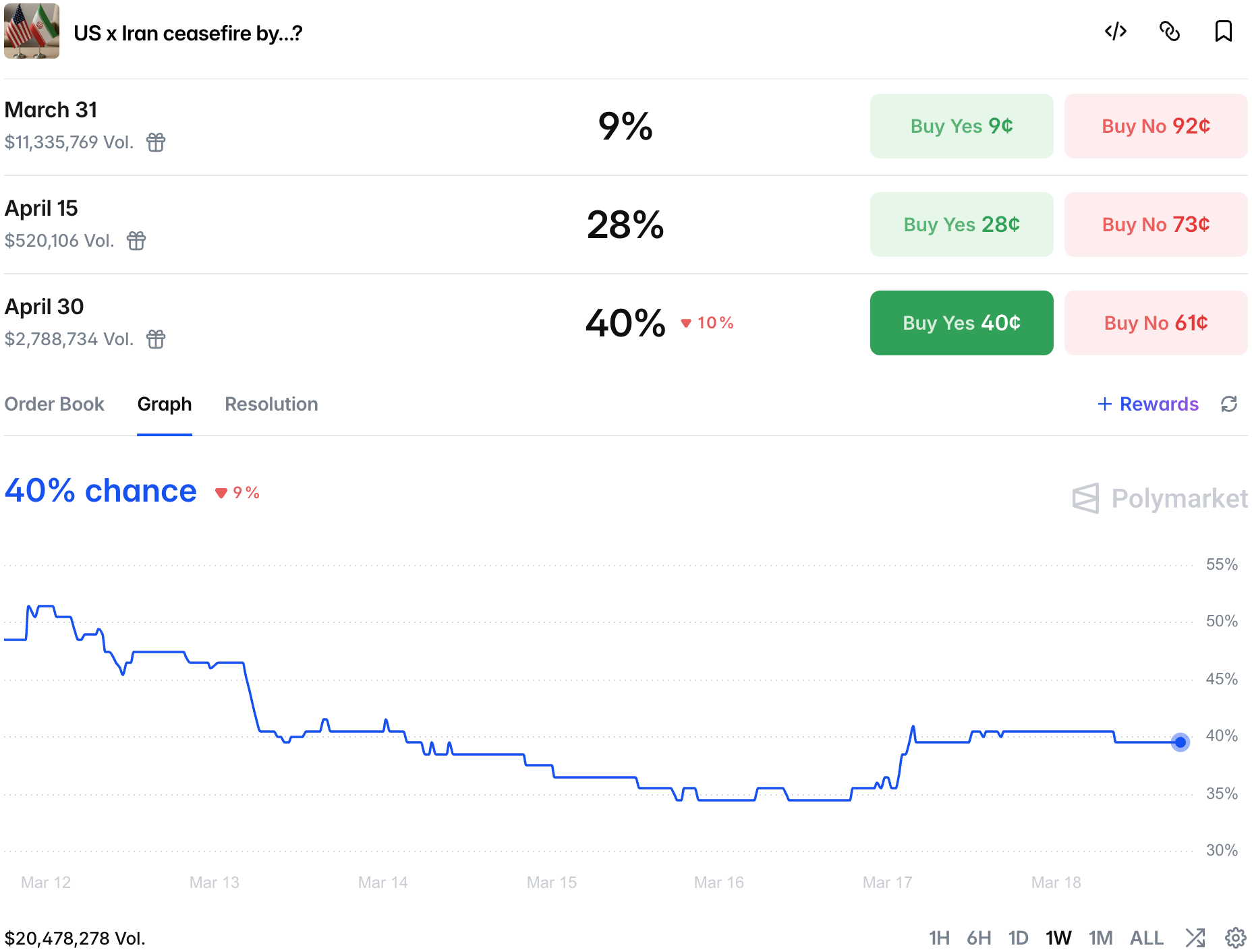 Ceasefire chances continue to be flat. The increasingly prevailing pattern now is that each bullish message elevates the chances and the spike remains semi-permanent even as bearish messages come.