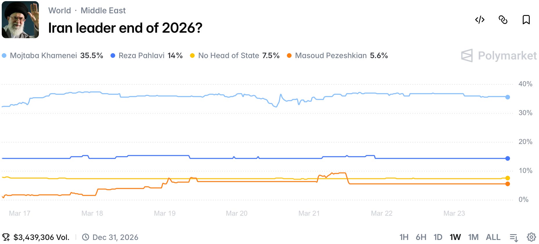 Mojtaba Khamenei continues to enjoy the Supreme Leader position and his chances of staying there by the end of the year are flat for the week.