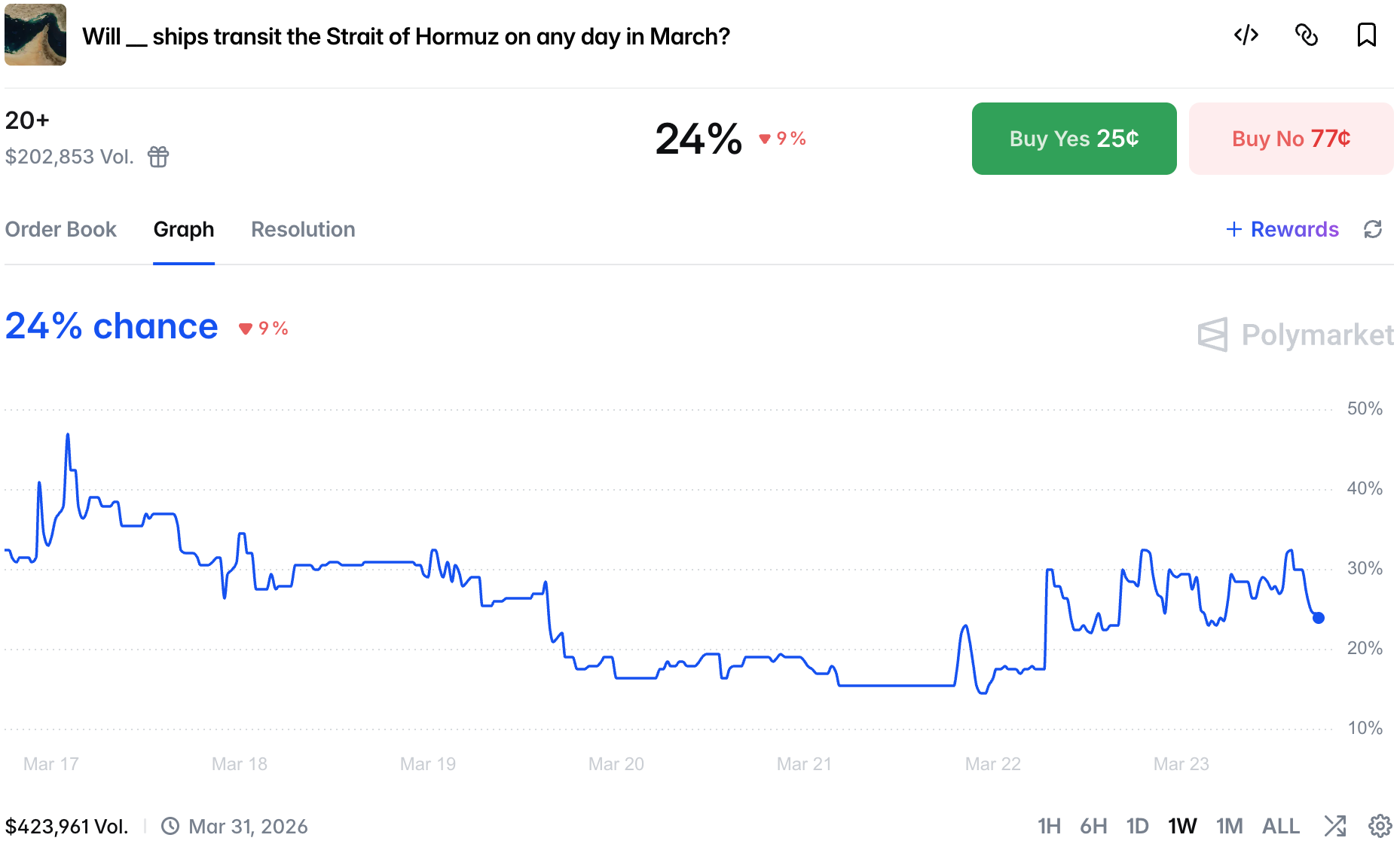 The Strait of Hormuz continues to be effectively closed. In the meantime the price of 20+ ships moving through the strait in a day moved up slightly as traders felt a bit bullish on the prospect of escort operation happening: