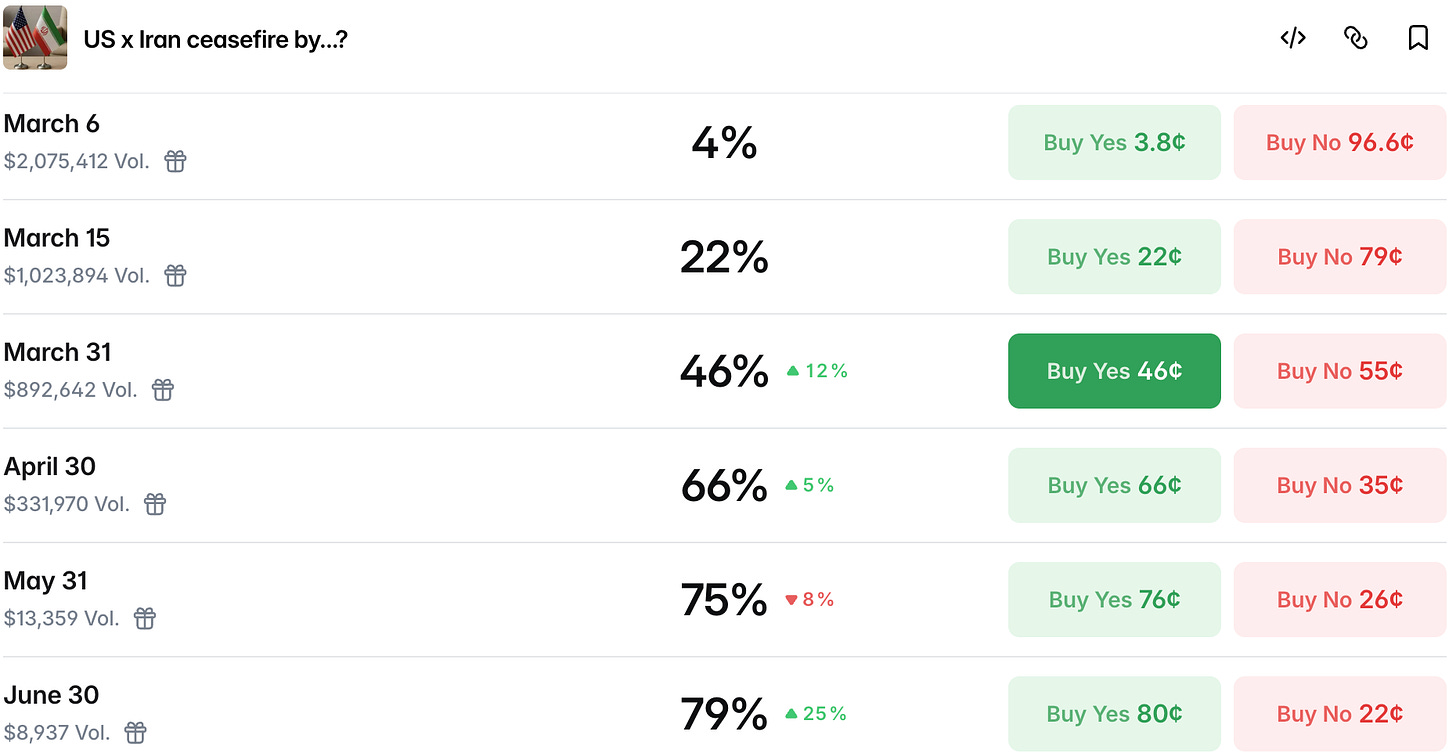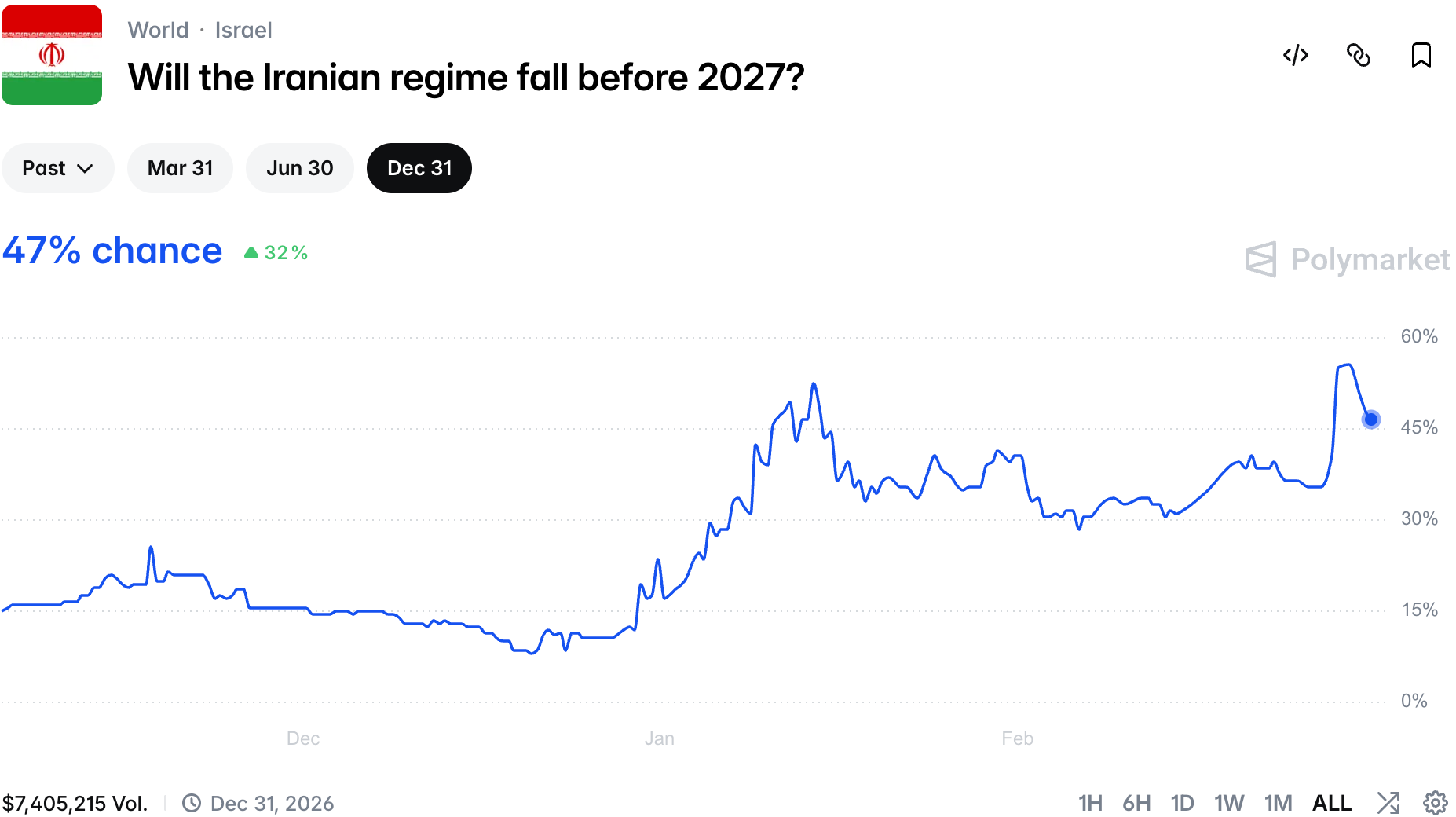 In reality, Trump cannot limit his options as the situation is dynamic. But a 40% chance of US forces in Iran by the end of the year is a sign that at least some traders don't see a quick resolution.