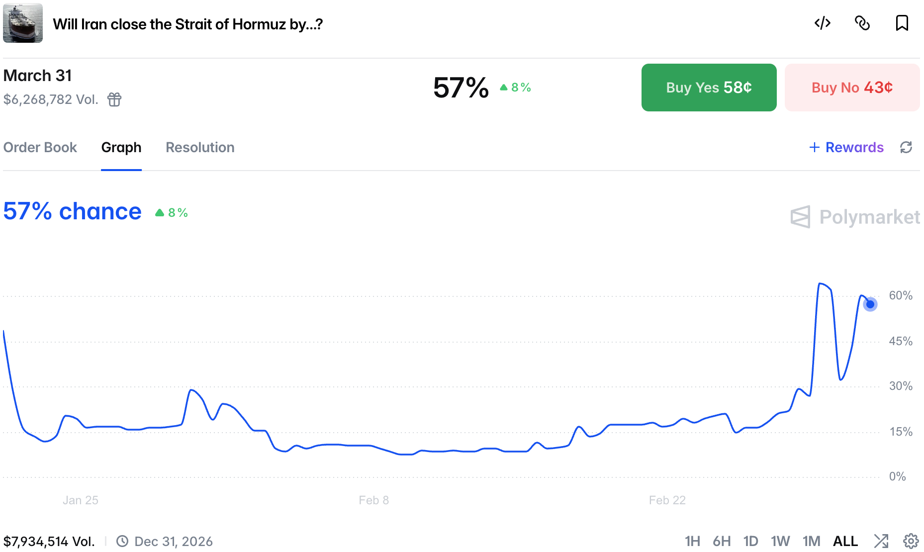 For it to resolve to Yes, a 7-day moving average of traffic through the Strait must decrease by at least 80%. However a definitive declaration combined with insurers denying coverage makes traders more confident that the Strait will be effectively closed.