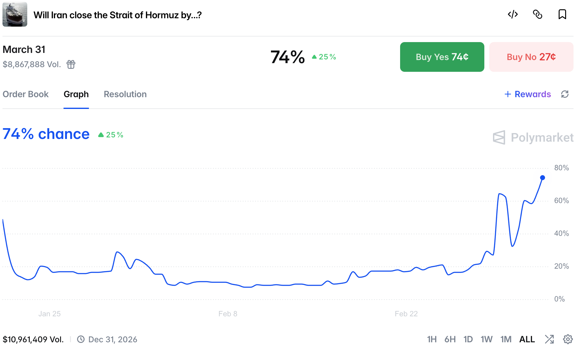 Prediction markets are also reacting to the de facto closure of the Strait of Hormuz. While the market is currently in dispute, it is indisputable that the traffic through the Strait is close to zero.