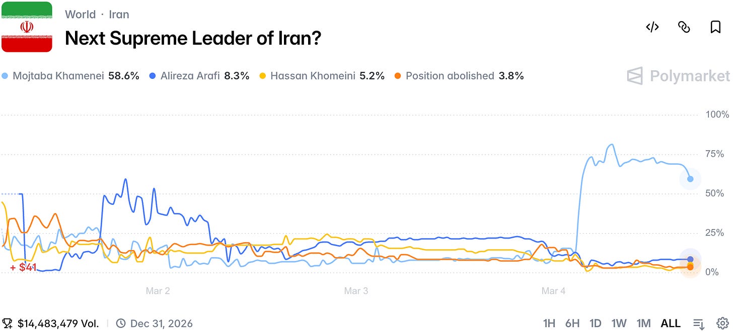 Rumors are that the second eldest son of deceased Ali Khamenei is to get the position. He seems to be confirmed alive after the strike on the assembly, putting him in as the obvious favorite. A good indication of the short-term resilience of the regime.