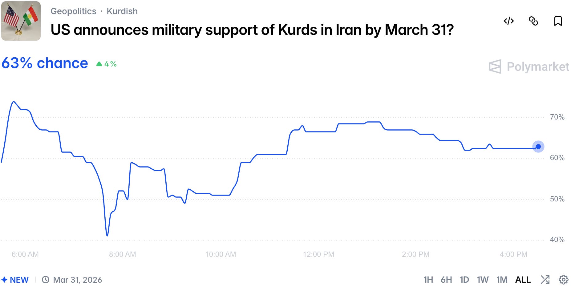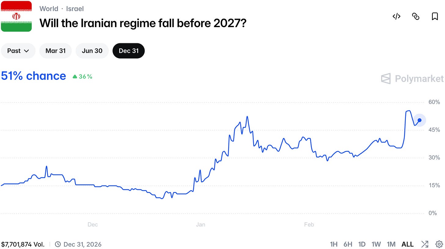 It is clear that you can't achieve proper regime change without boots on the ground.. However, there is an option in the short-term - rumors are that the Kurds are being enrolled to march on Tehran. Traders price in 63% chance we will see an official announcement by the end of the month!