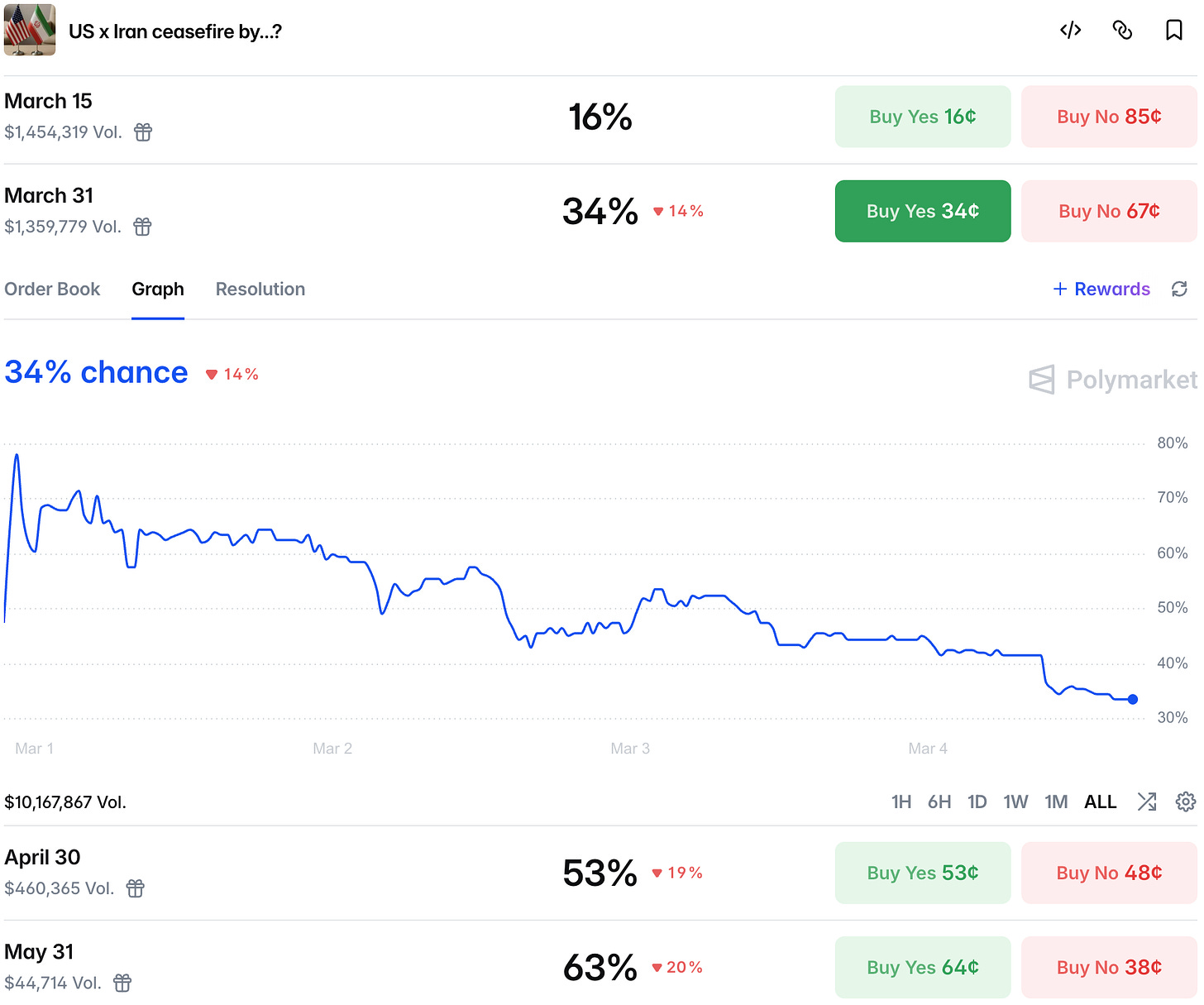 The fall by the end of the year is priced as a coin-flip, indicating uncertainty rather than a fundamental assessment of the situation. Because despite all the strikes on the Iran's capital, the regime still looks resilient to strikes alone.