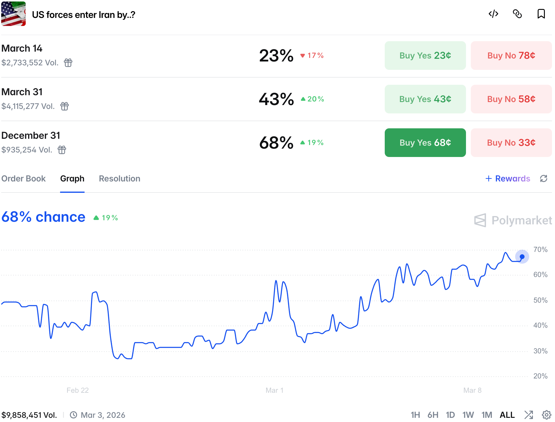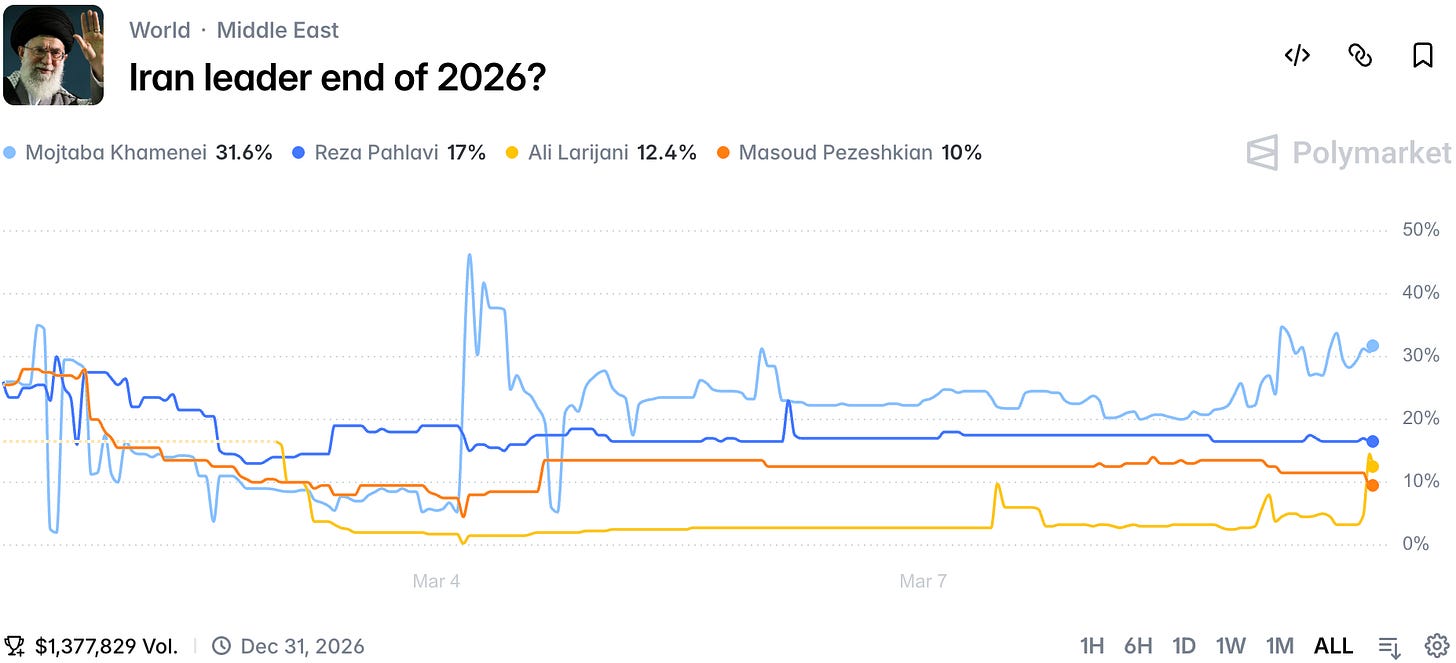 However, traders see his chances of surviving till the end of the year as slim with only 32% allocated to him on the Supreme Leader at the end of 2026 market.