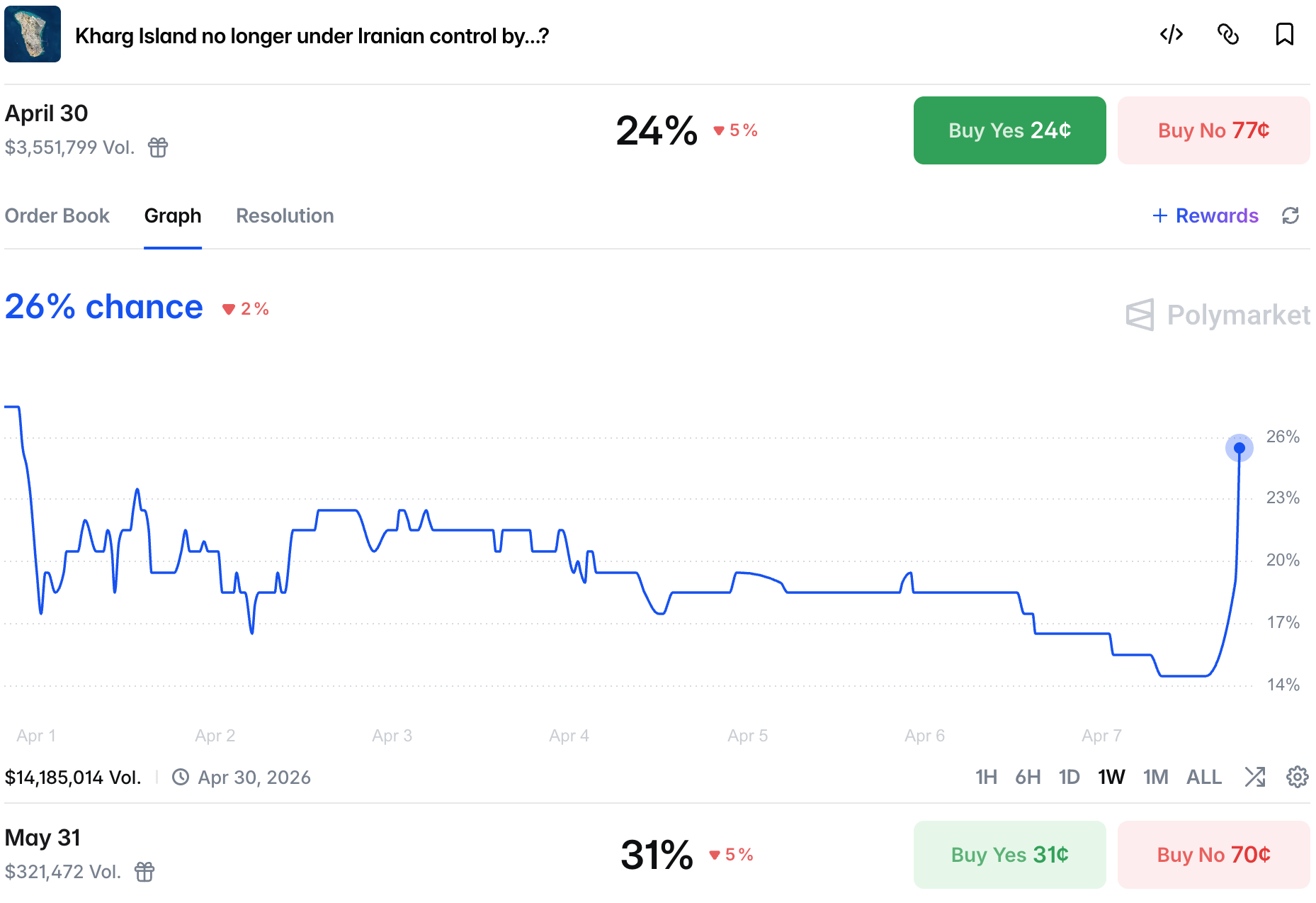 The chances for a proper US invasion are slightly up. A hit on the Kharg Island resulted in chances of its invasion rising sharply:
