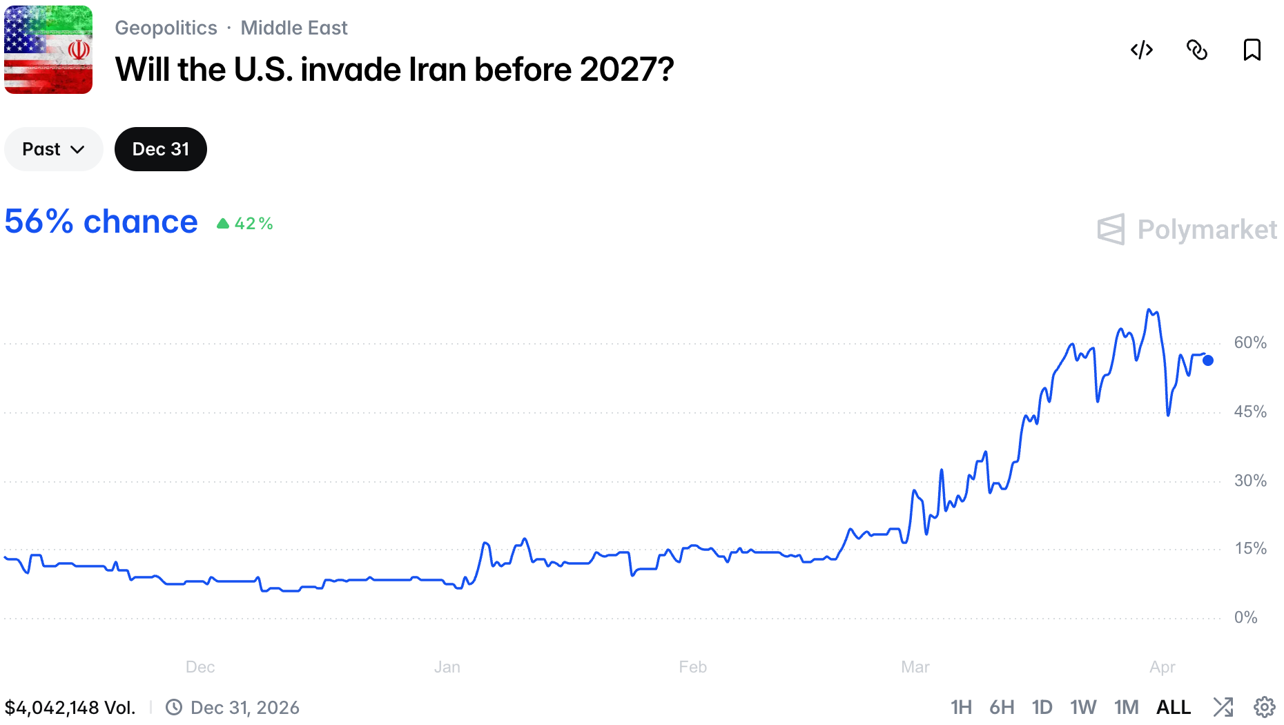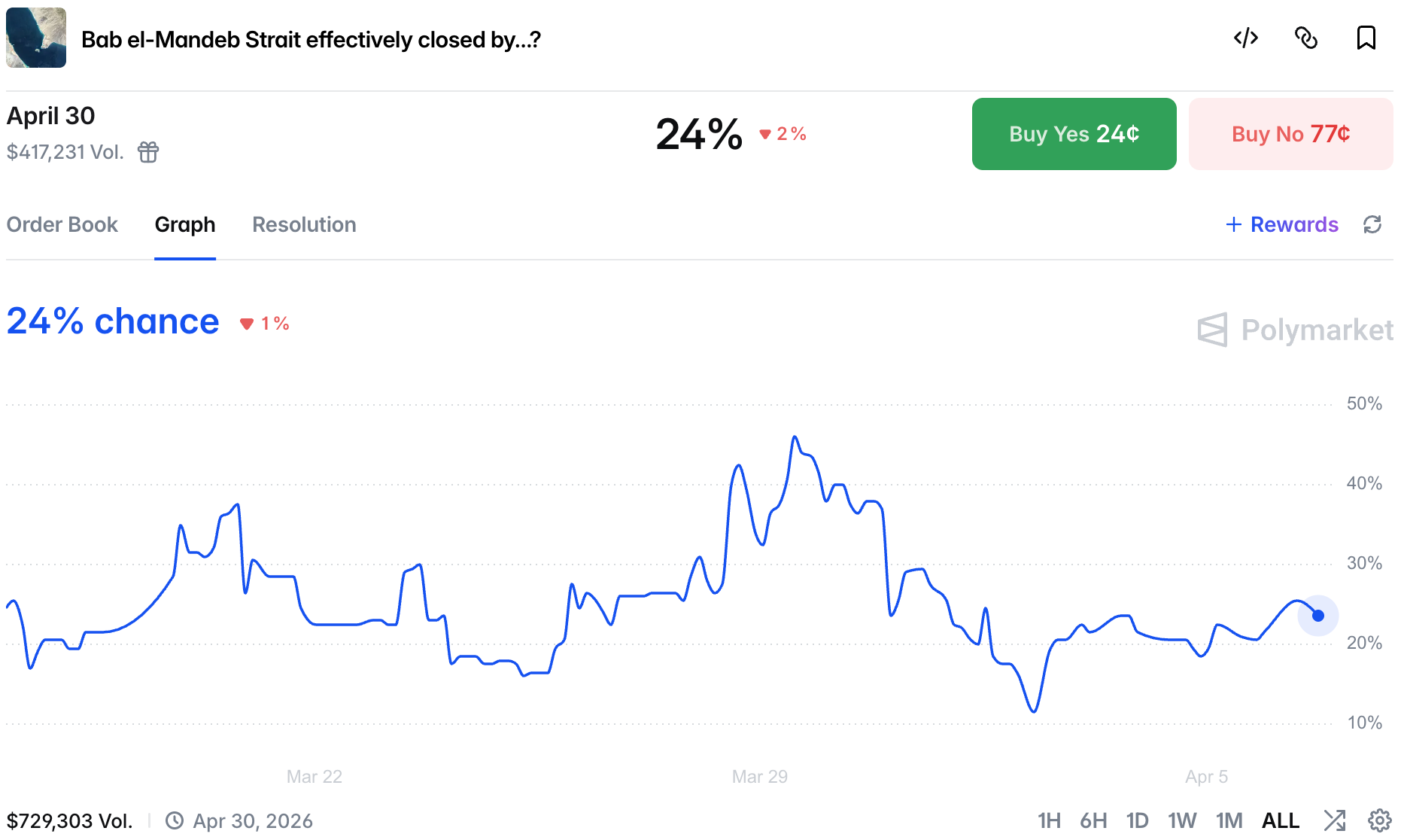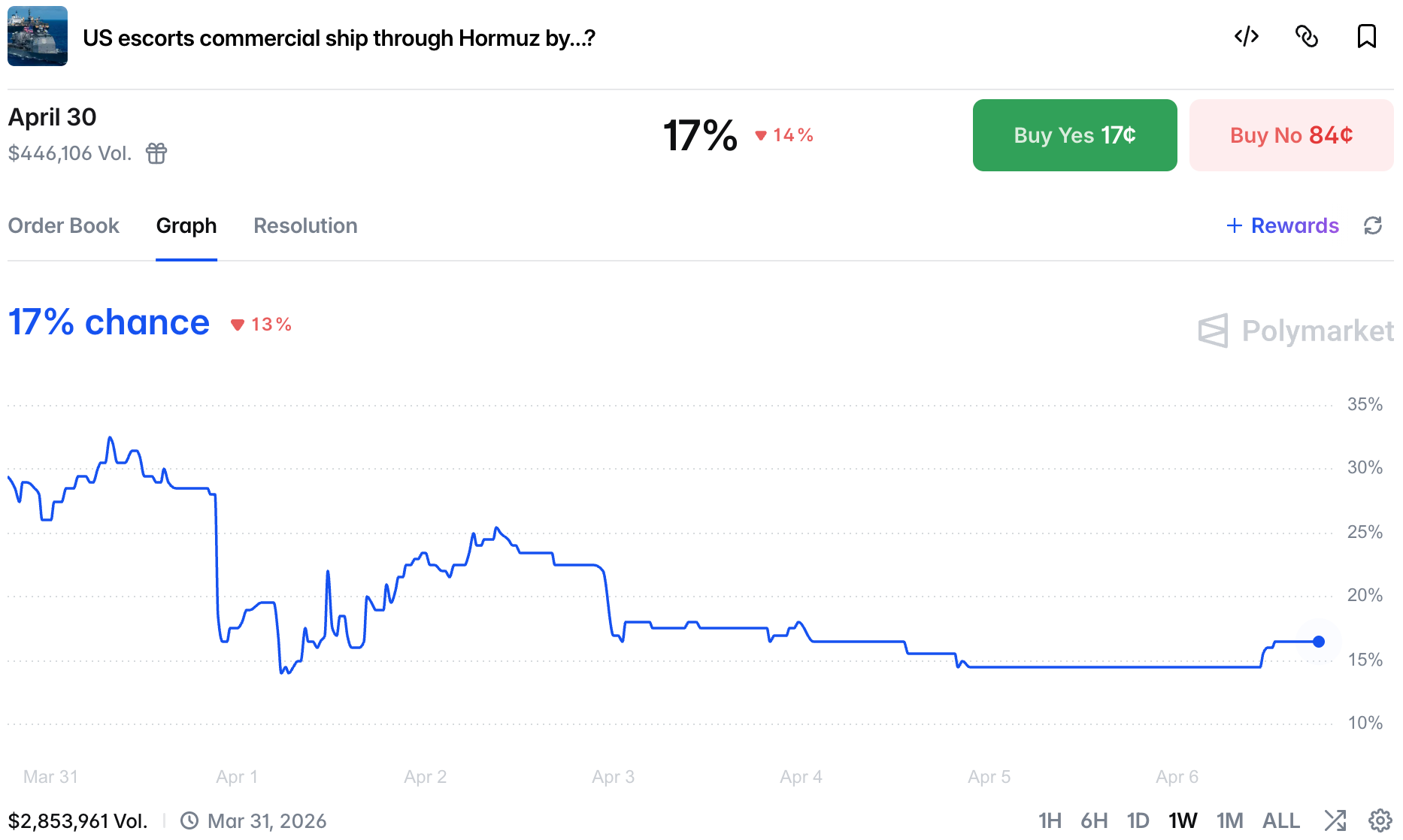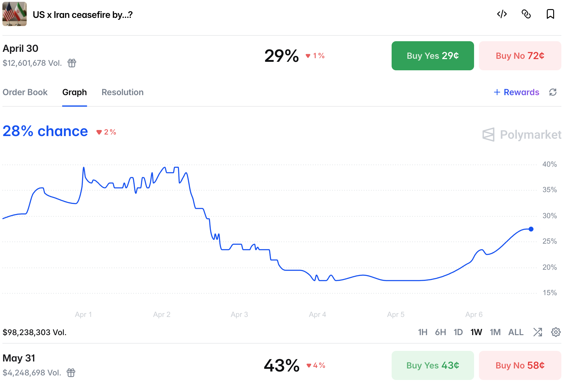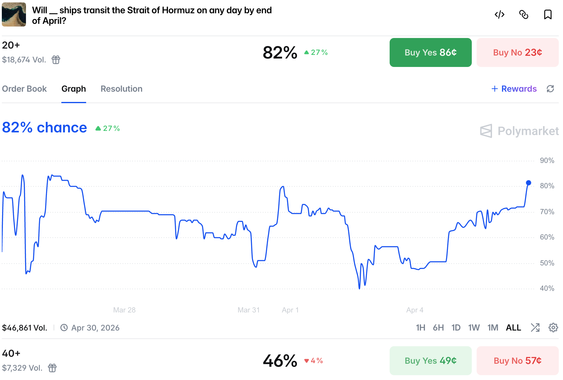 However, 40+ bracket is priced at 46%, showing that any hope of a return to normal is limited. At the same time chances of a US-led escort operation remain low: