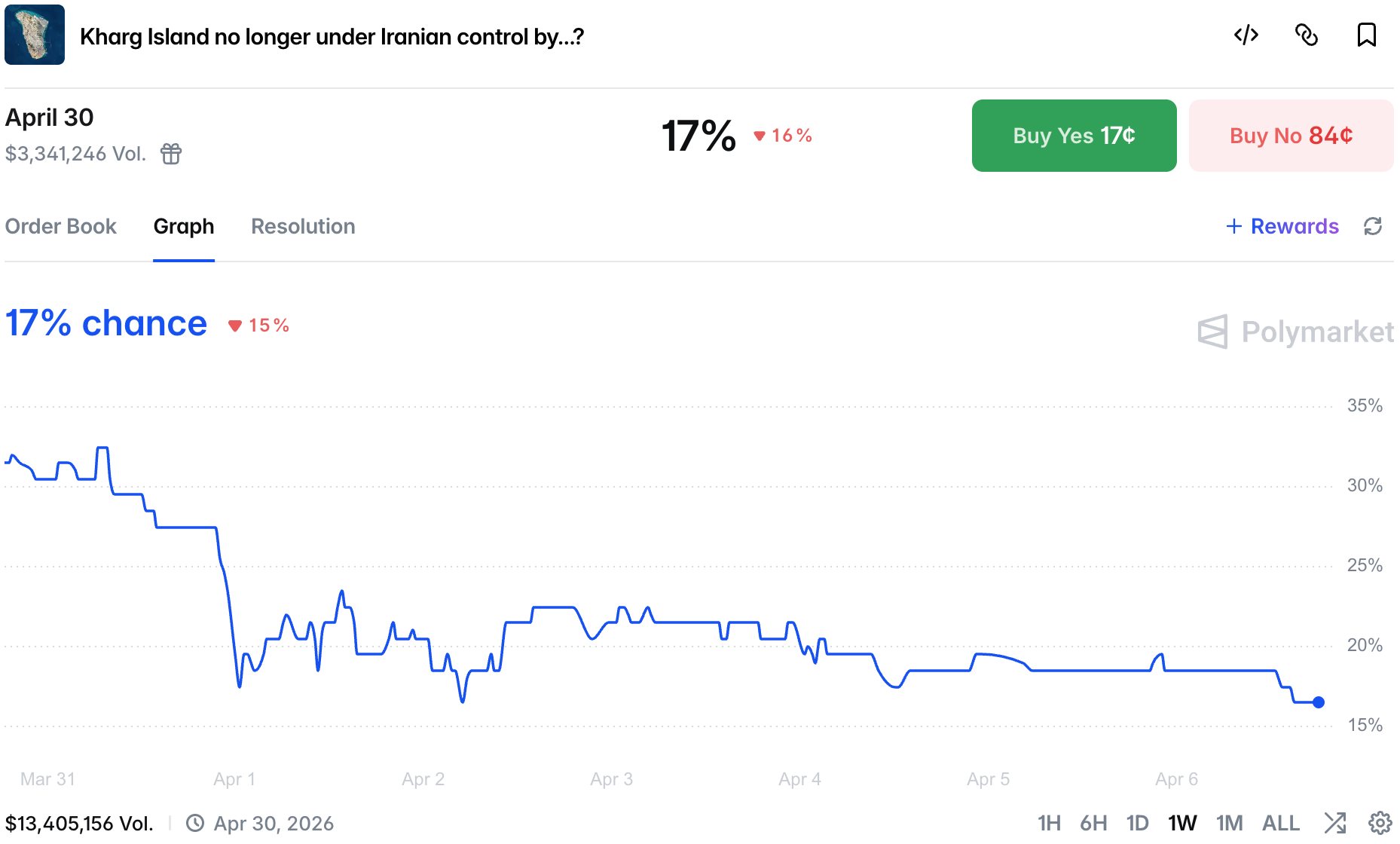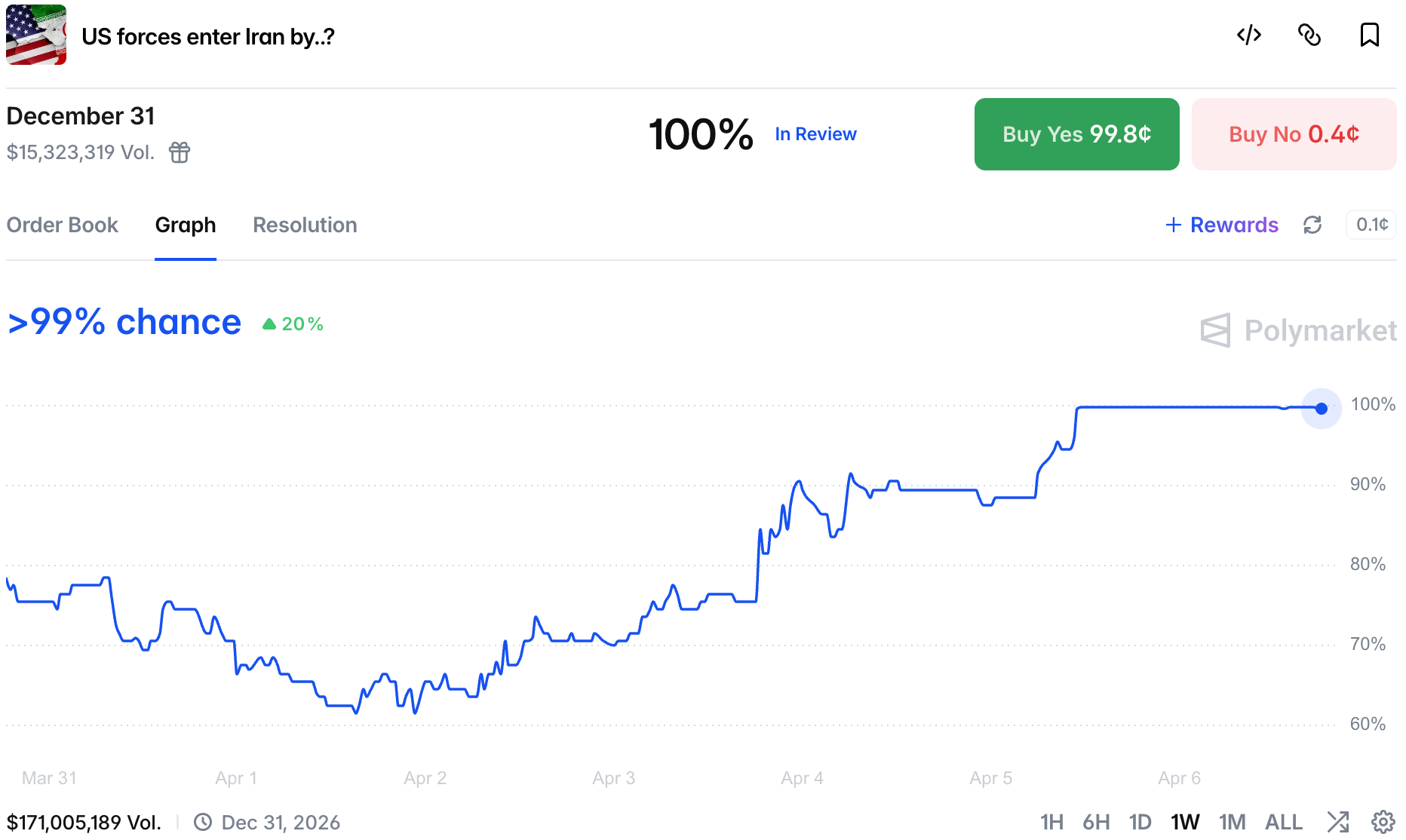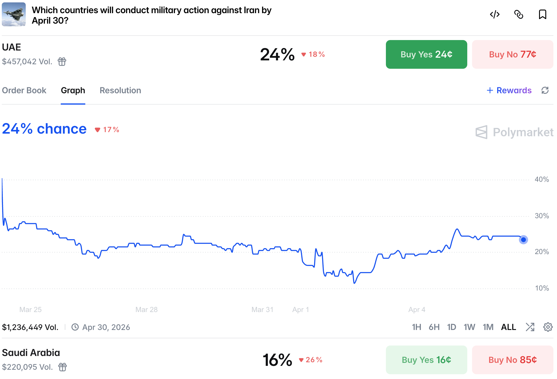 Despite the failed UN vote on the Iran war, chances of UAE involvement rose over the weekend to 24%.