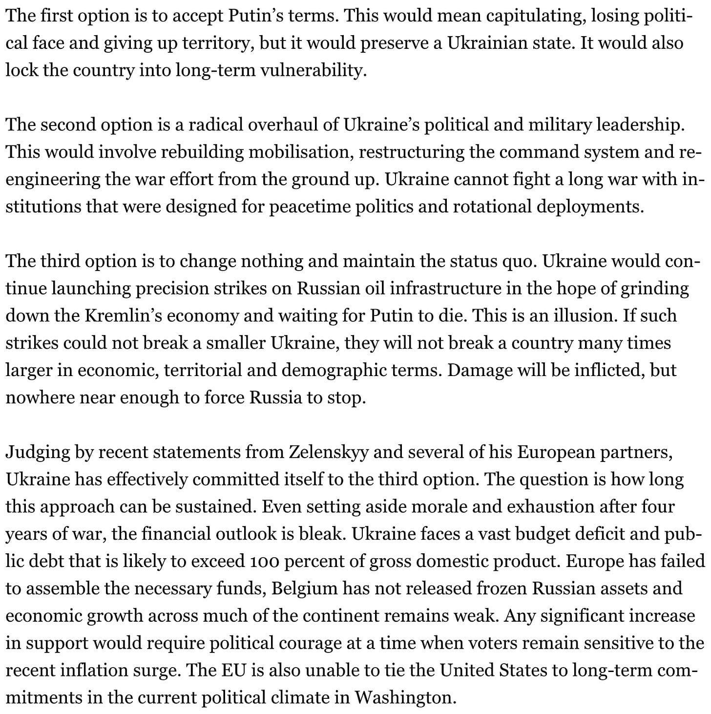 He is right - Europe has no balls to conduct the second option at the moment and will continue with the third for the foreseeable future. But the time will come again when Trump will once again have enough leverage to try peace. And then we shall see if they have what it takes and make Ukraine a proper military state it is inevitably going to be. That would also be the time to install Zaluzhny.