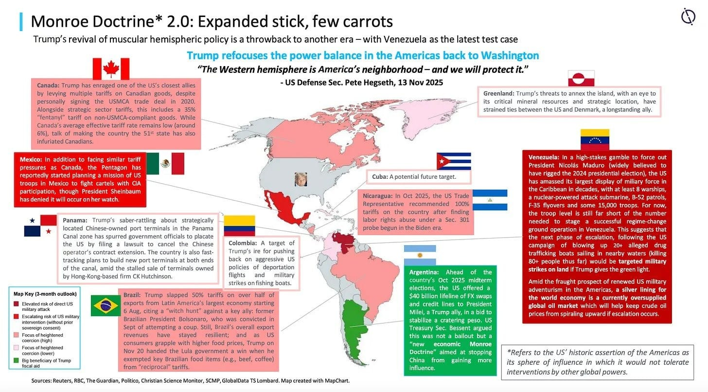 This essentially moots the current peace effort. Europe will manage to prop up the Ukrainian zombie state for a while. Russia is also holding pretty well and with Venezuela strikes looming, it is looking to do even better, at least financially. I won’t put here another 1,000 words on the state of Russia, you’re better off reading Ivan’s deep dive on the topic where he covers the state of the Russian economy, society and politics better than I could ever do.